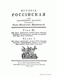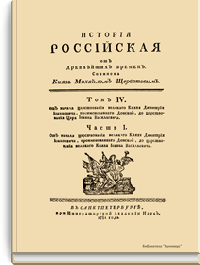 (также князю доверили разобрать и систематизировать архив Петра I). Начиная с 1770 г. вышло 7 томов, охватывающих историю России с древнейших времен до 1610 г. Следуя за идеями французских просветителей, Щербатов не только описывал действия исторических личностей, но и указывал, что за их поступками кроются определенные мысли, идеи, нравы, господствующие в обществе. И это было новым по отношению к предшествующей историографии.