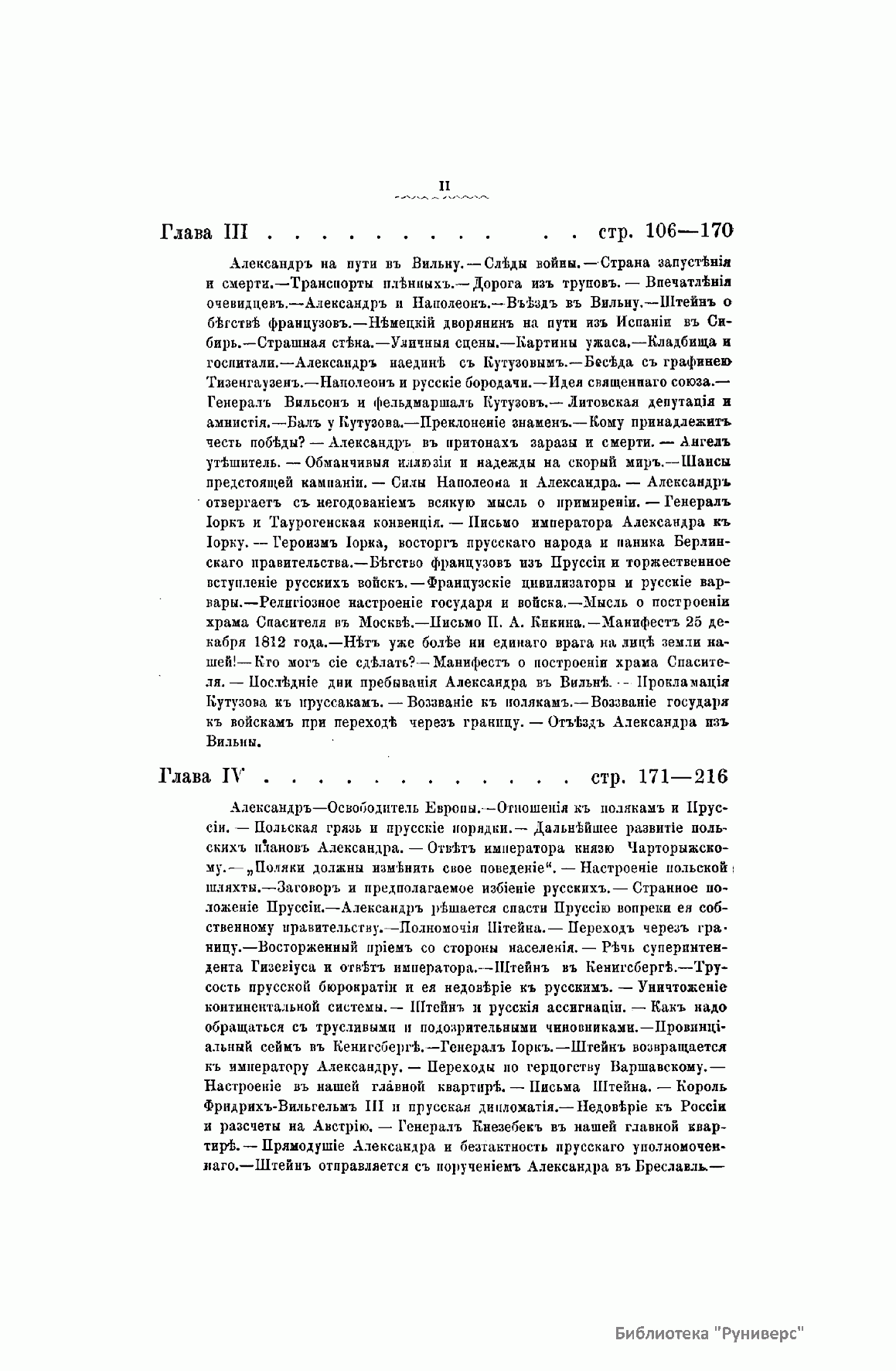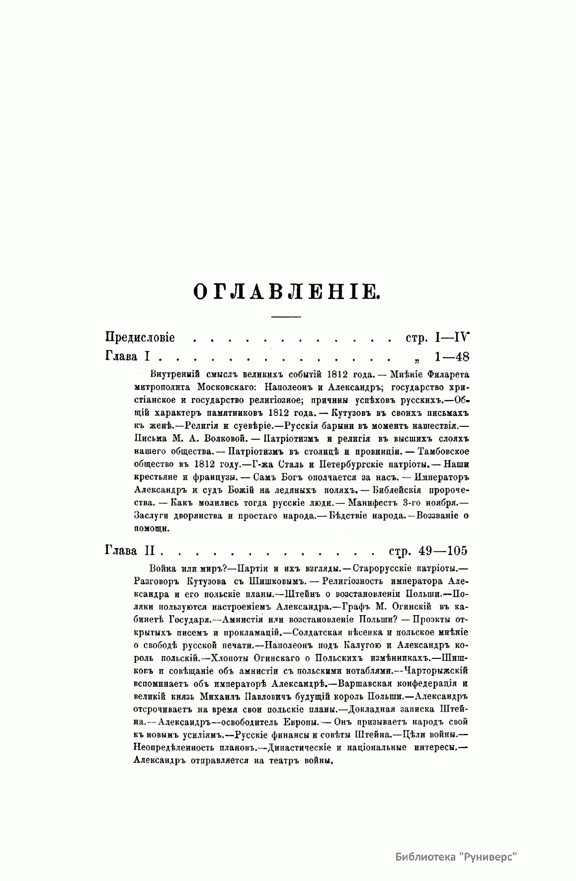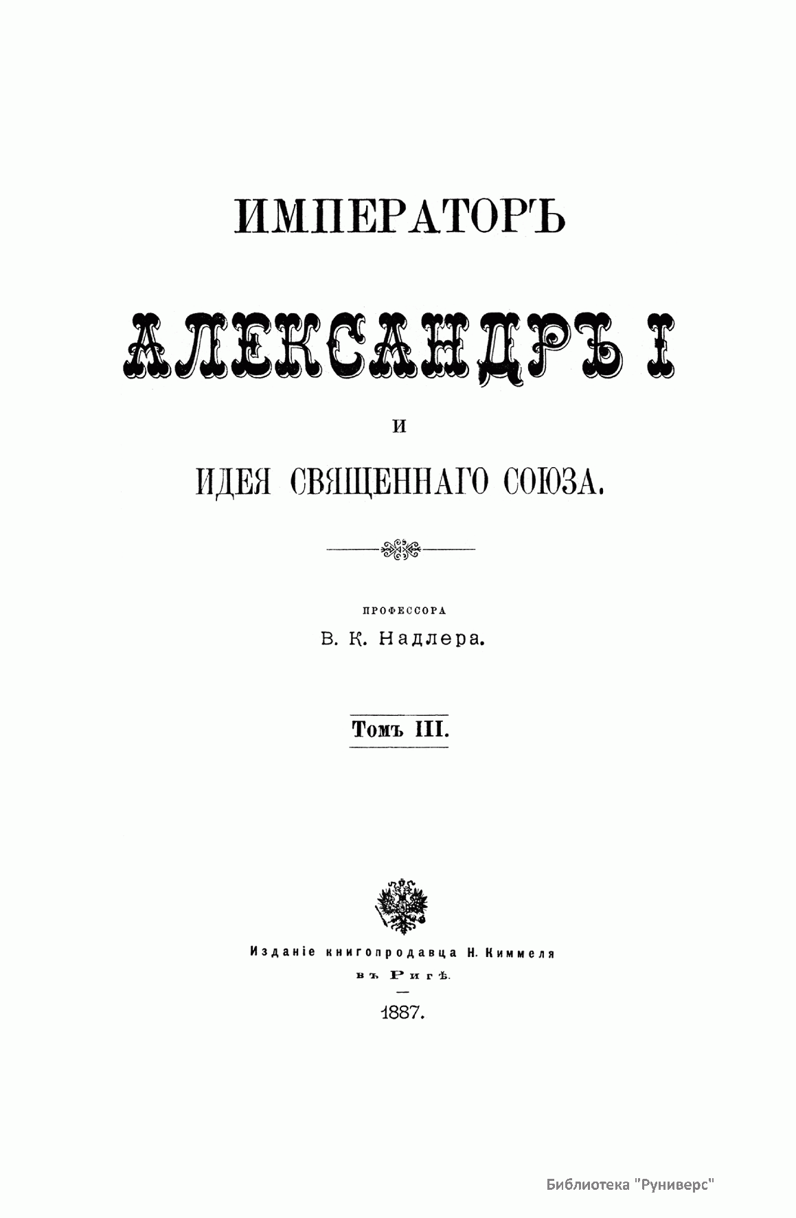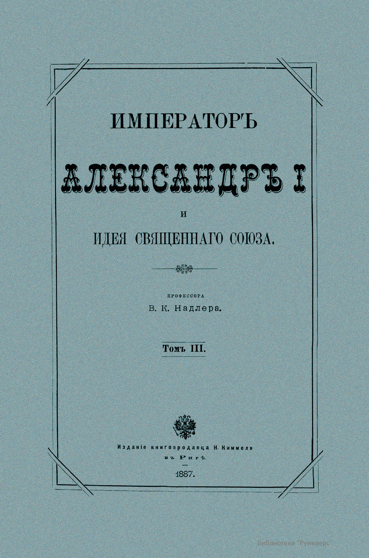 Пятитомное фундаментальное исследование профессора В. К. Надлера «Император Александр I и идея Священного союза» посвящено внешней политике России в 1812–1815 гг. с экскурсами в предшествовавшие и последующие времена и события. Издание было выпущено книгопродавцем Н. Киммелем в Риге в 1886–1892 гг., напечатано в харьковской типографии Окружного штаба. Автор сделал вывод, что идея Священного союза была единственной до начала ХIХ в. «серьезной и искренней попыткой организовать международные отношения на чистых началах христианской нравственности». Акт о Священном союзе содержал религиозно-мистическую фразеологию, возможно заимствованную из учения масонства. В статье I три договаривающихся монарха объявлялись соединенными «узами действительного и неразрывного братства», совсем как члены ма­сонской ложи высоких степеней. Они именовались «тремя ветвями од­ной семьи» и обязывались помогать друг другу в открытии «сокровищ любви, науки и беспредельной мудрости». Сочинение В. К. Надлера на историческом материале было призвано показать, что создание Священного союза опередило свое время, и не было понято современниками. Том I повествует о внутренней политике в России при Александре I. В нем рассматриваются вопросы внешней политики европейских держав, отношение к Наполеону и Отечественная война 1812 г. Том II рассказывает о завершении Отечественной войны — изгнании французов с земель России, а также переговоры и дипломатические отношения России с союзниками, подготовка к дальнейшей войне против Франции. Том III подводит итог прошедшей войне, здесь рассматриваются стратегические планы на 1813 г., переговорный процесс с союзниками и начало весенней кампании 1813 г. Анализируется ход сражений 1813 г. Том IV повествует о событиях 1814 г.: поражение Наполеона, оккупация Франции, восстановление монархии Бурбонов, переговоры и дипломатическая борьба союзников. Том V рассказывает о событиях 1815 г.: созыв Венского конгресса и его решения о создании Священного Союза, «100 дней» Наполеона и борьба с ним, вторичное восстановление монархии Бурбонов. Василий Карлович Надлер (1844–1894) — историк, профессор Харьковского, Новороссийского университета. Главные труды: «Причины и первые проявления оппозиции католицизму в Чехии и Западной Европе в конце XIV и начала XV века» (Харьков, 1864; магистерская диссертация); «Адальберт Бременский, правитель Германии в молодые годы Генриха IV» (Харьков, 1967; докторская диссертация); «Мифический элемент в истории» (Харьков, 1887) и др.