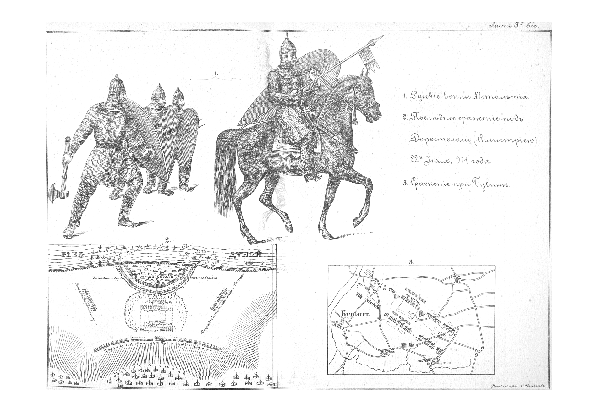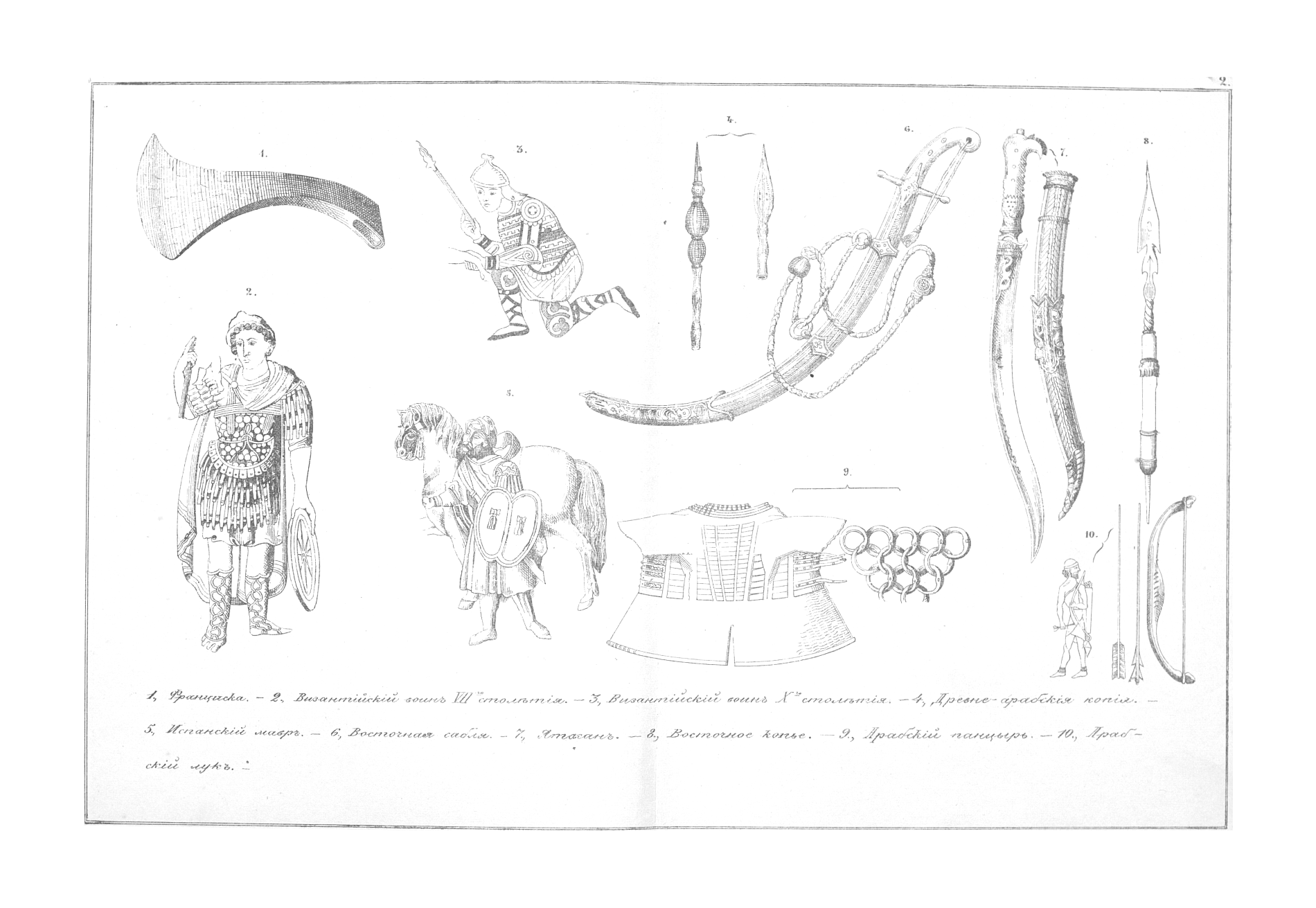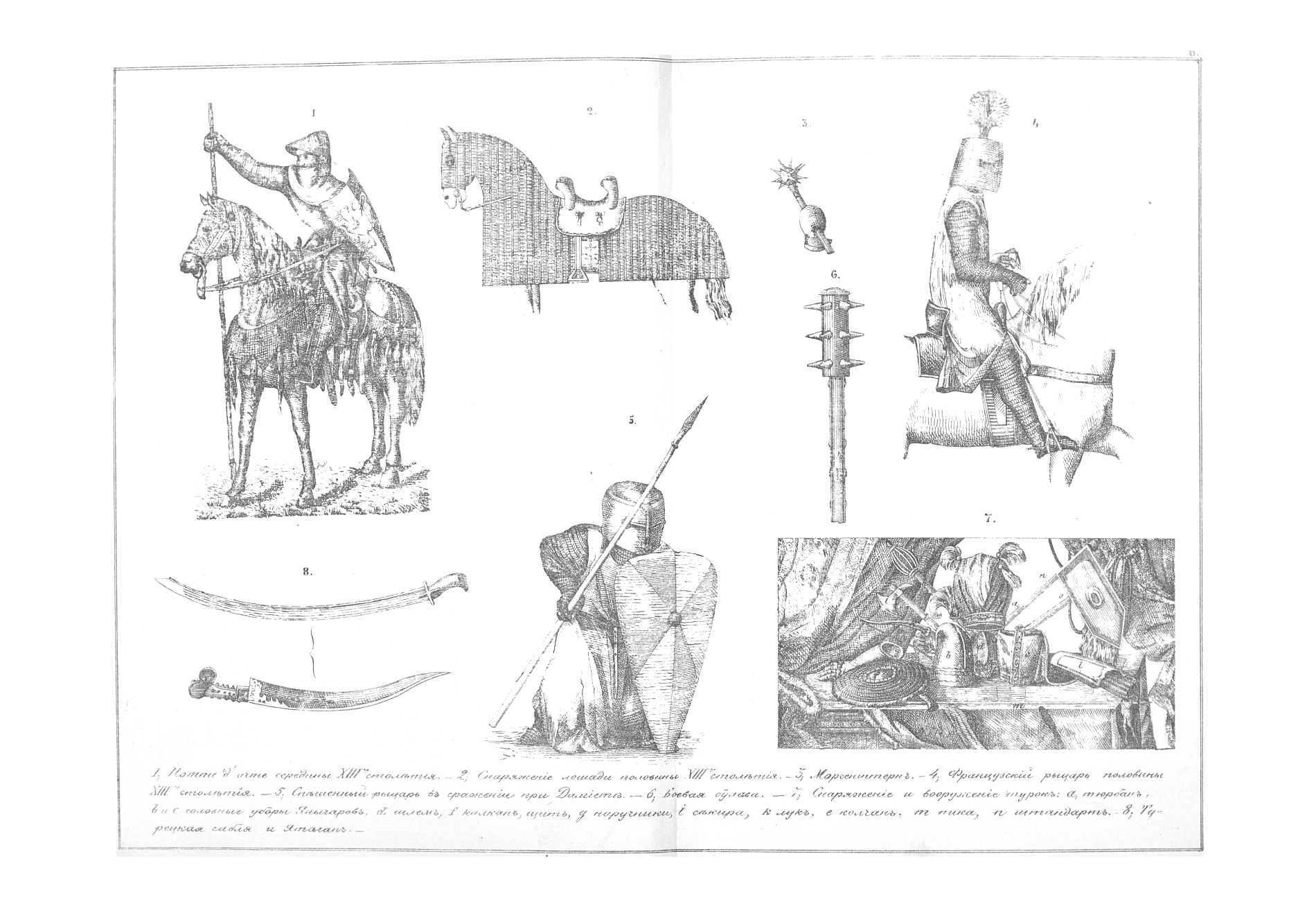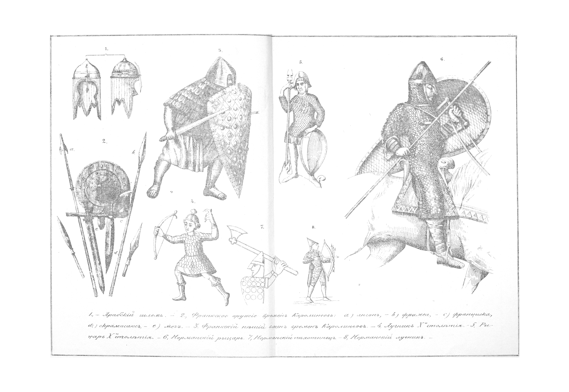 Схемы основных сражений периода европейского Средневековья, подготовленные профессором Николаевской Академии Генерального Штаба по кафедре военного искусства полковником А.К. Пузыревским для иллюстрации читаемого им курса, дополнены оригинальными рисунками военного костюма и вооружения воинов изучаемой эпохи.