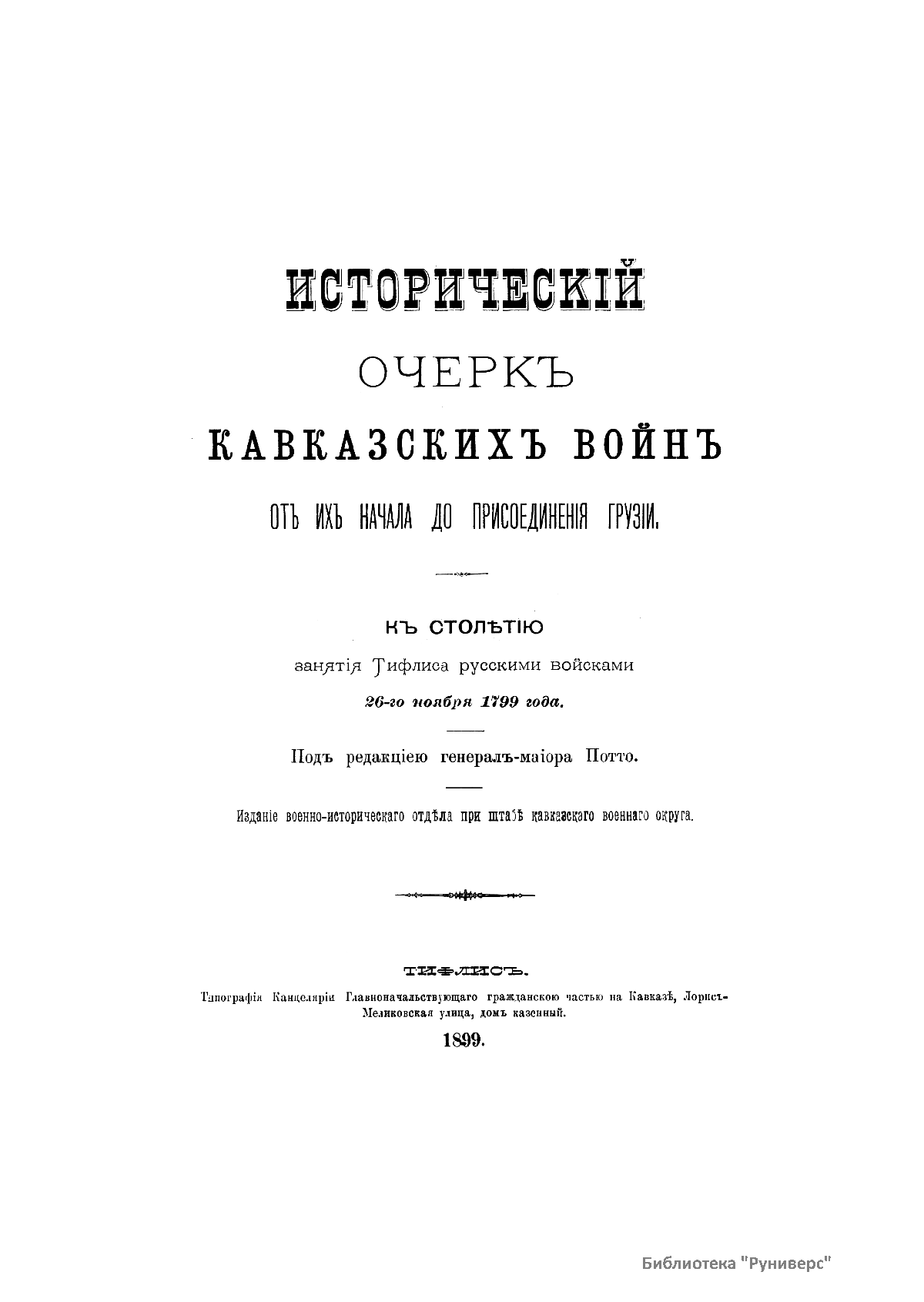 Труды выдающегося русского венного историка, генерал-лейтенанта Василия Александровича Потто (1836–1911), освещающие этапы прихода и становления русской власти в кавказском регионе, историю многолетних кавказских войн и развития казачества, обогатили русскую военную литературу и по праву считаются одними из лучших произведений кавказской тематики. Многие годы В. А. Потто собирал разрозненные документы, военные хроники и архивные материалы, чтобы отобразить общую картину драматических событий, определивших особую роль кавказских войн в истории российского государства. В 1896 г. В. А. Потто был назначен начальником военно-исторического отдела при Штабе Кавказского военного округа, где значительно расширил свою издательскую деятельность. Под его редакцией вышли «Утверждение русского владычества на Кавказе» в 8 томах, «Кавказский сборник», издававшийся в Тифлисе в 1876–1912 гг., «История терского казачества» в 2 томах, «Памятники времен Кавказской войны». «Исторический очерк Кавказских войн от их начала до присоединения Грузии к России» был издан по распоряжению командующего войсками Кавказского военного округа в 1899 г. в Тифлисе. Издание иллюстрируют портреты русских императоров и военачальников, грузинских царей, карты Кавказа.