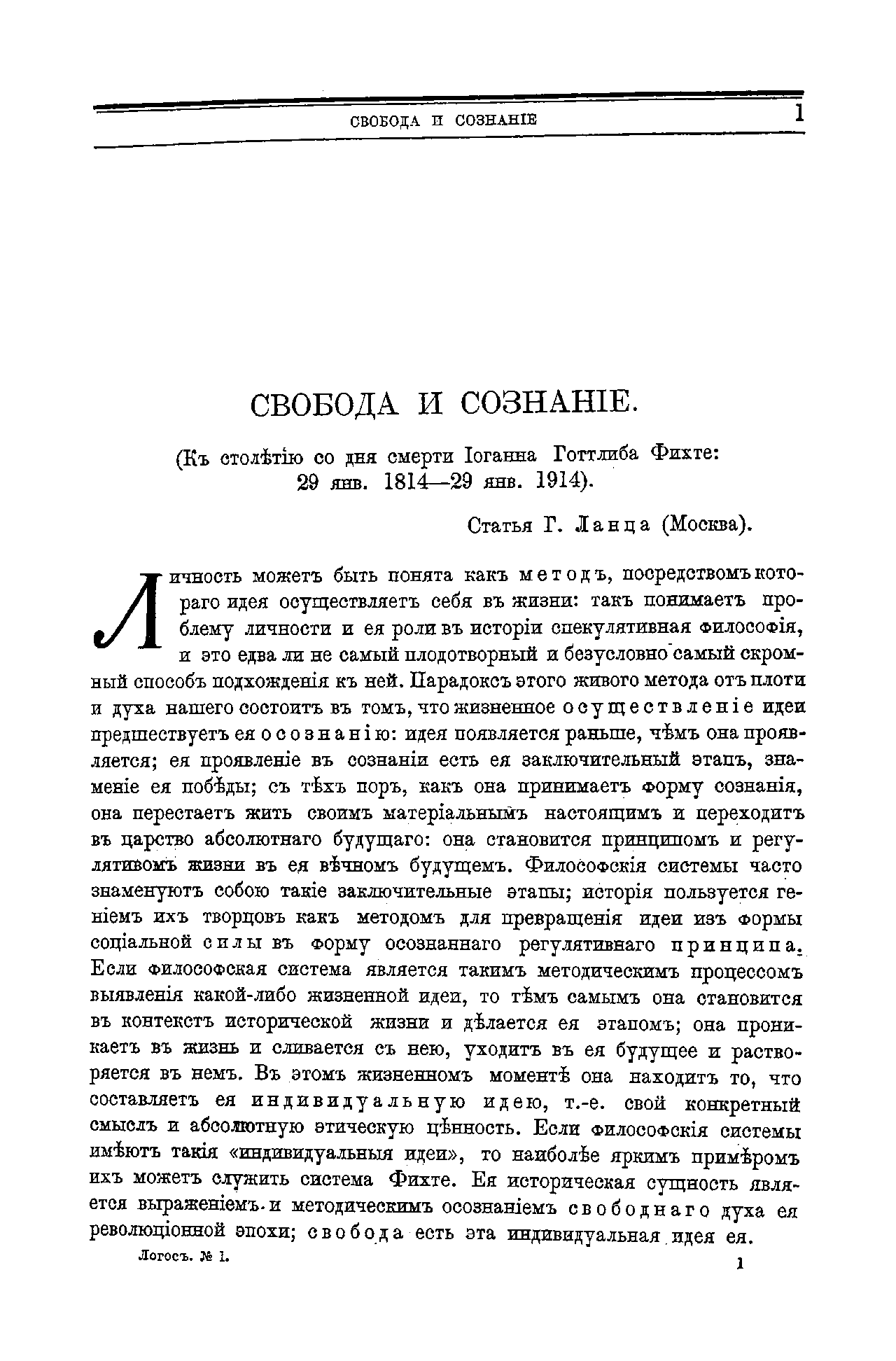 Логосъ. Международный ежегодникъ по философiи культуры. 1914. Томъ I - выпуск 1