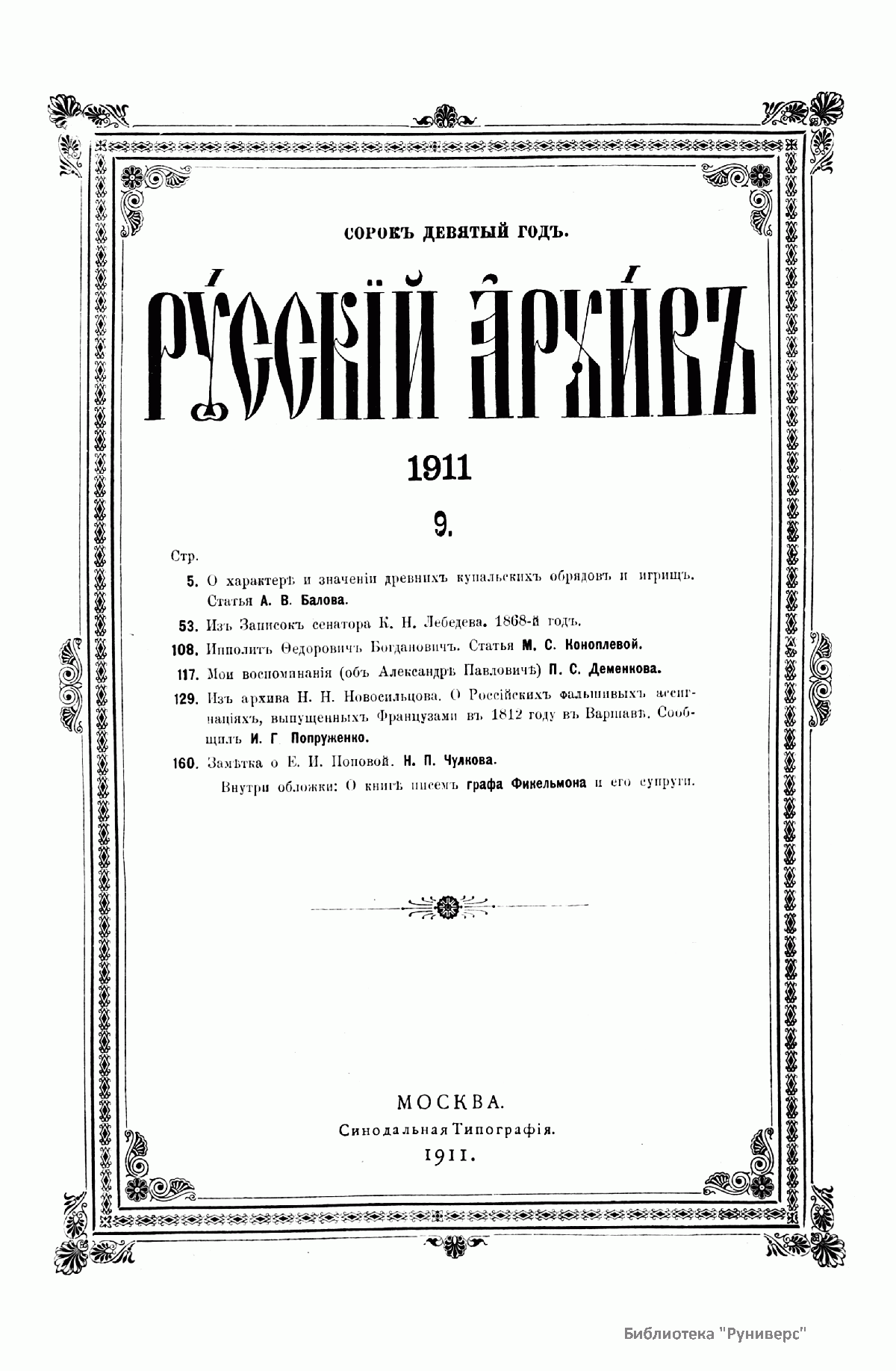 Русскiй архивъ. Историко-литературный сборникъ. 1911. Выпуски 9-12
