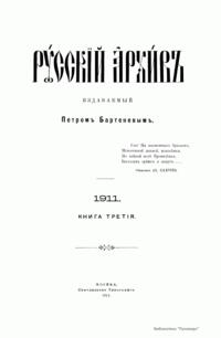 «Русский архив» — ежемесячный историко-литературный журнал, издававшийся в Москве с 1863 по 1917 год. Создателем и продолжительные годы редактором журнала был П. И. Бартенев – историк, археограф, библиограф. Этот журнал называли «живой картиной былого», поскольку он содержал преимущественно публикации неизданных мемуарных, эпистолярных, литературно-художественных и ведомственных документальных материалов, освещавших культурную и политическую историю России в XVIII и XIX вв. По числу опубликованных источников «Русский архив» стоит на первом месте среди русских исторических журналов.