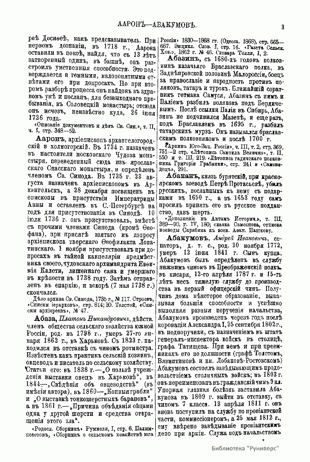 Русский биографический словарь (25 томов), в состав которого вошли имена и биографии виднейших деятелей государства, науки, просвещения и церковных деятелей, издавался Русским историческим обществом с 1896 по 1918 год. Русское историческое общество было основано в Санкт-Петербурге в 1866 году по инициативе известных отечественных историков, военных и государственных деятелей и ставило своей целью всесторонне содействовать развитию русского национального исторического просвещения. Общество пользовалось покровительством и финансовой поддержкой императорской семьи. Его деятельность носила археографический характер. Члены общества собирали исторические документы, которые публиковались в «Сборниках русского исторического общества». Всего до 1920 года (в этом году общество было закрыто) вышло 148 томов. Таким образом в научный оборот было введено большое количество документов XVIII – начала XIX века, ранее недоступных для исследователей, так как документальные материалы архивов царской России были для историков закрыты. К изданию русского биографического словаря, материалы которого до сих пор являются интереснейшим источником для исследователей, Общество приступило по инициативе императора Александра III. Тома биографического словаря выходили не в алфавитном порядке. С 1896 по 1909 год редактором словаря был руководитель Русского исторического общества, промышленник, член Сената Александр Александрович Половцев. Он выпустил 1, 2, 3, 6, 8, 12, 13, 14, 15, 18, 19, 21 и 22-й тома, поэтому этот словарь известен еще как «словарь Половцева».
