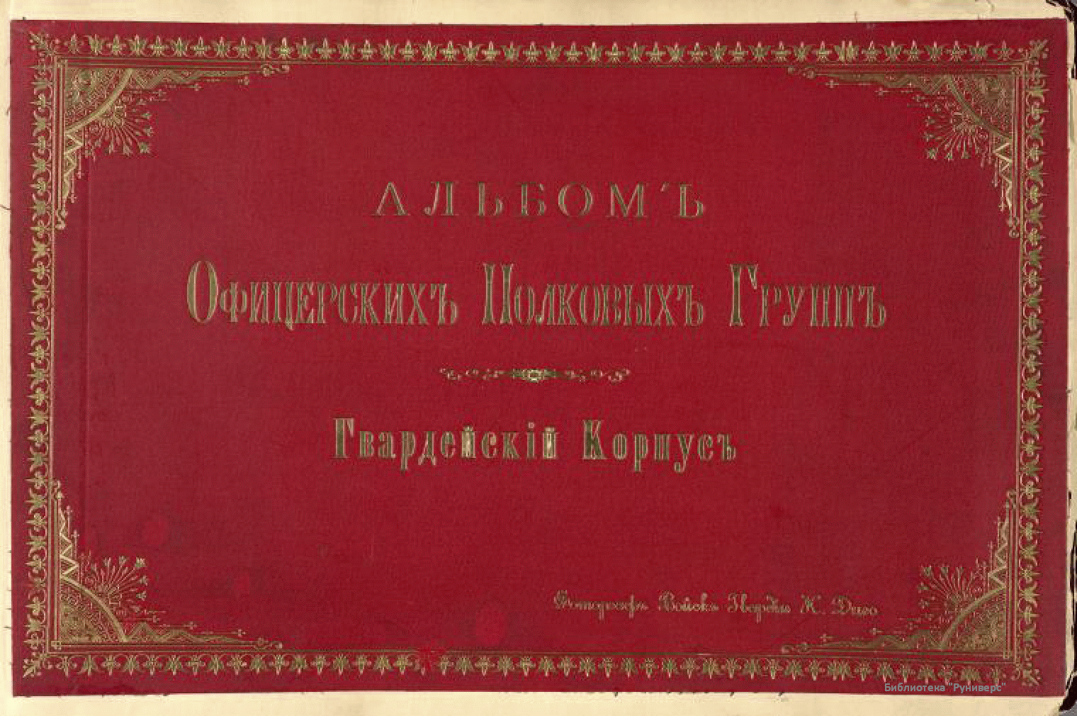 Изданный в 1889 г. известным фотографом Дмитриевым (Н.Д. Диго) «Альбом офицерских полковых групп. Гвардейский корпус» содержит 28 фотографий офицеров гвардейских полков Русской императорской армии.