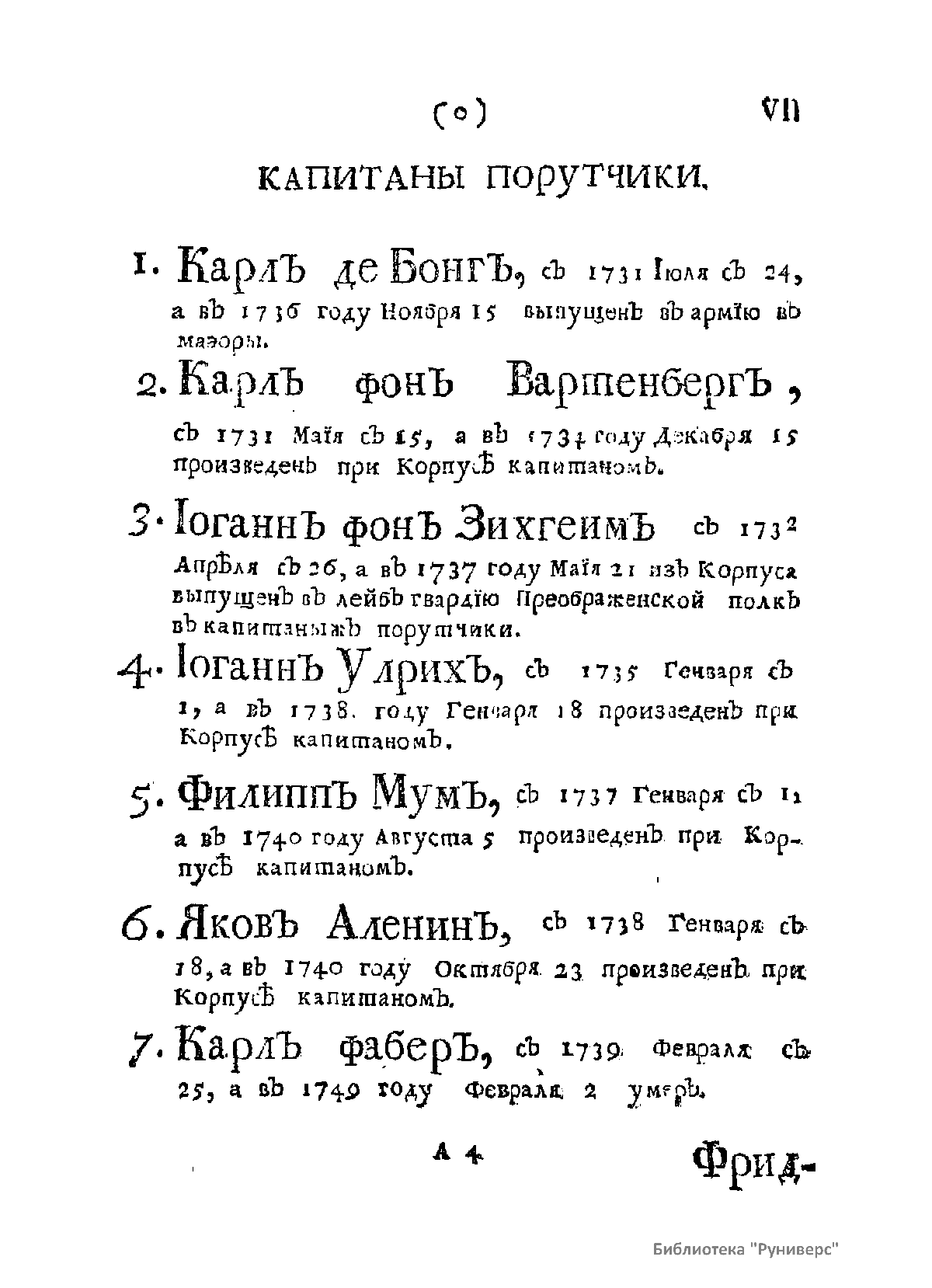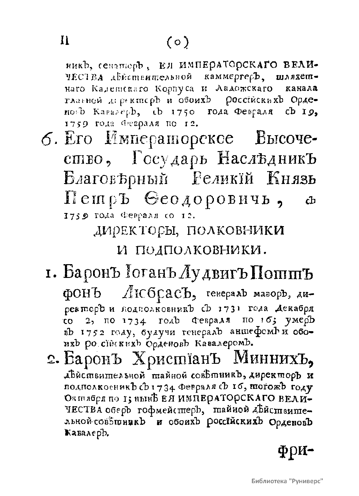 Список живущих и умерших на 1761 г. штаб- и обер-офицеров – руководителей, преподавателей и выпускников Сухопутного Шляхетского кадетского корпуса, а также обучающихся в тот период кадетов Корпуса с краткими личными характеристиками каждого. Список составлен и издан по приказу великого князя Петра Федоровича (будущего императора Петра III).