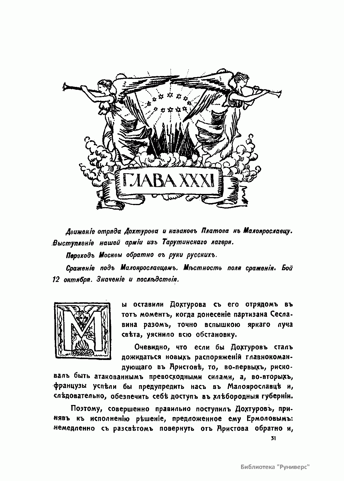 Книга военного историка, полковника Петра Андреевича Ниве «Отечественная война» является юбилейным изданием 1912 г., которое имело целью восстановить точную, во всех ее деталях историческую канву событий Отечественной войны 1812 г. Данное издание богато иллюстрировано, в нем представлены планы и карты всех крупных сражений «Русской кампании Наполеона».