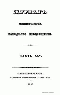 Журнал Министерства народного просвещения выходил с 1834-го по 1917 год. Официальный периодический журнал об успехах просвещения в России. Издатели журнала уверены в том, что «если для каждого человека необходим выход из грубой тьмы невежества и беспрерывное дальнейшее движение к свету, то для народов необходимо попечительное участие правительства в образовании. Только правительство имеет все средства знать и высоту успехов всемирного образования, и настоящие нужды Отечества».