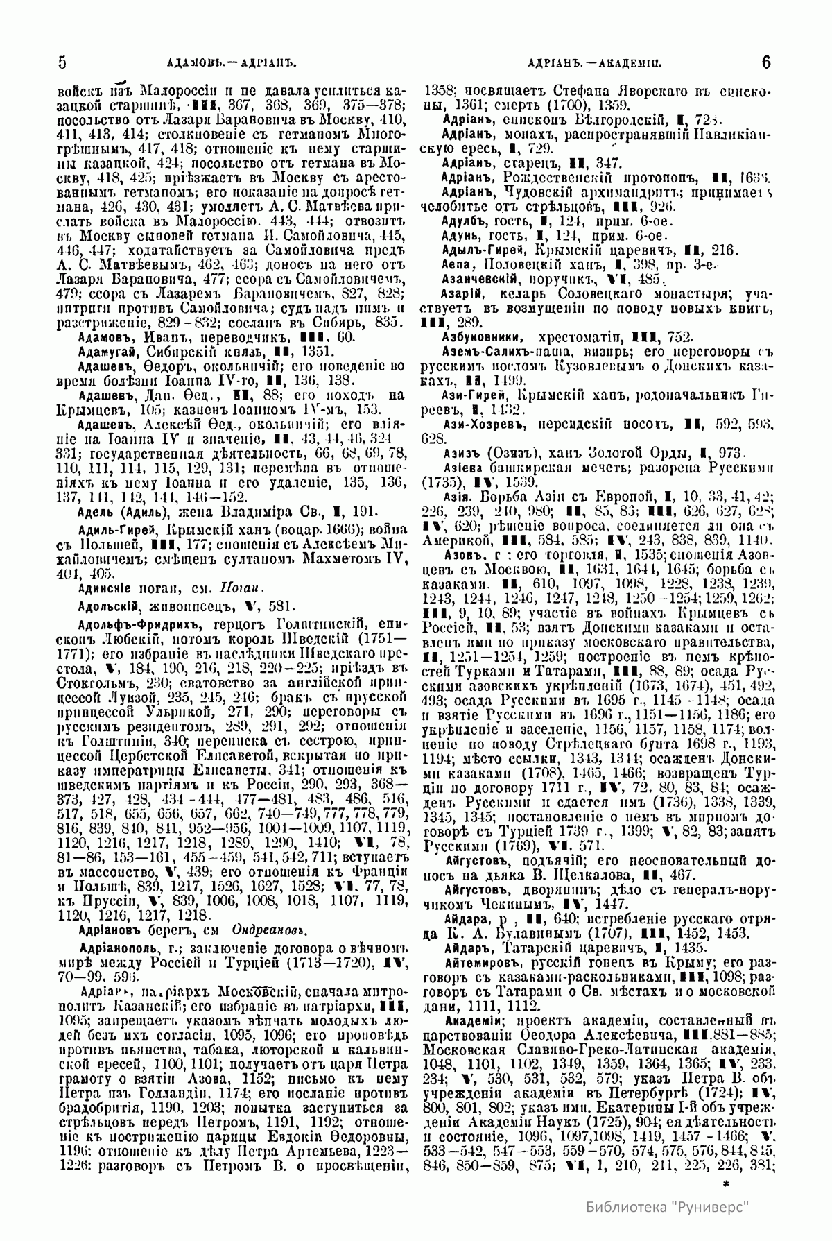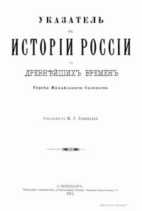 Алфавитный указатель к «Истории России с древнейших времен», который прилагался ко второму изданию книги, составил сын историка Михаил Сергеевич. В «Указателе» римская цифра, напечатанная жирным шрифтом, означает одну из шести книг «Истории», арабская – страницу.