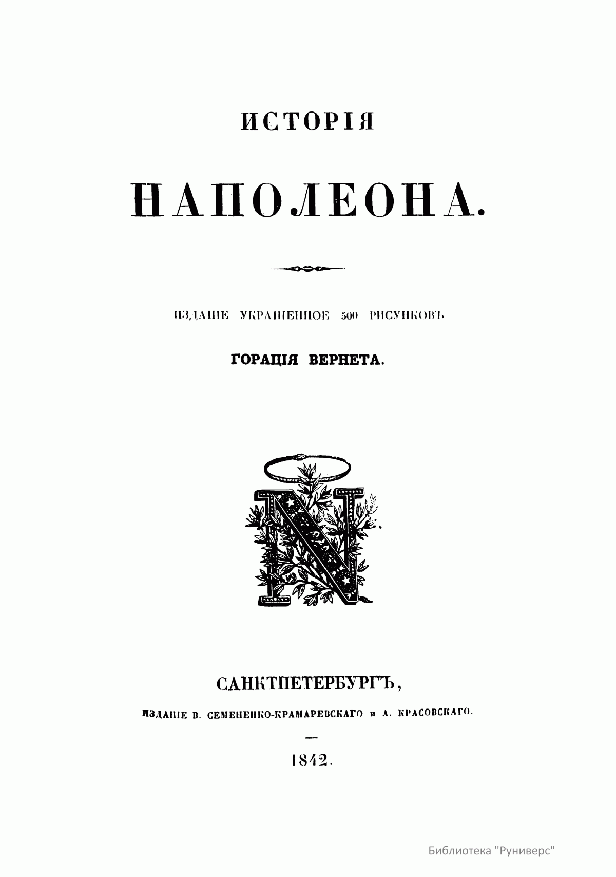 Настоящее издание – иллюстрированный перевод книги П. М. Лорана де лАрдеша (Paul-Matie-Laurent de l’Ardèche; 1793 – 1877) «История императора Наполеона» (Histoire De L’Empereur Napoleon), вышедшей в 1839 году в Париже. В парижском издании было 830 страниц, 500 рисунков официального баталиста, историографа наполеоновской армии Антуана-Шарля-Ораса Верне (Antoine-Charles-Horace Vernet, 1758 – 1836), а также 44 цветных изображения типов военной униформы, автором которых был ученик Верне – Жозеф-Луи-Ипполит Беланже (Joseph-Louis-Hippolyte Bellange). История написана человеком, восторгавшимся гением Наполеона. В русском иллюстрированном издании В. Семененко-Крамаревского и А. Красовского, вышедшем в 1842 году в Санкт-Петербурге под названием «История Наполеона», 640 страниц, цветные иллюстрации в это издание не вошли. Наполеон I (Наполеон Бонапарт, 1769 – 1821), французский император в 1804 – 1814 гг. и в марте – июне 1815 г. Уроженец Корсики. Начал службу в войсках в 1785 г. в чине младшего лейтенанта артиллерии. В период Великой французской революции достиг чина бригадного генерала, при Директории – командующего армией. В ноябре 1799 г. совершил государственный переворот (18 брюмера), в результате которого стал первым консулом, фактически сосредоточившим в своих руках с течением времени всю полноту власти. В 1804 г. провозглашен императором. Благодаря победоносным войнам значительно расширил территорию империи. С поражением в войне 1812 г. против России начался период распада империи Наполеона I. Вступление в 1814 г. войск антифранцузской коалиции в Париж вынудило Наполеона отречься от престола. Он был сослан на остров Эльба. Вновь занял французский престол в марте 1815 г. После поражения при Ватерлоо вторично отрекся от престола (22 июня 1815). Последние дни жизни провел на острове св. Елены пленником англичан.