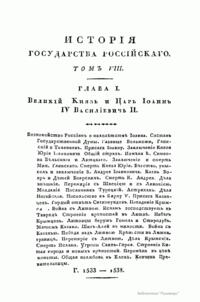 В 1816 году он выпустил первые восемь томов «Истории государства Российского», трёхтысячный тираж которых разошелся в течение месяца. В последующие годы вышли еще три тома «Истории», появился ряд переводов её на главнейшие европейские языки. Тенденциозно-монархическое освещение русского исторического процесса сблизило Карамзина с двором и царем, поселившим его подле себя в Царском Селе. Незаконченный XII том был издан уже после его смерти.