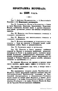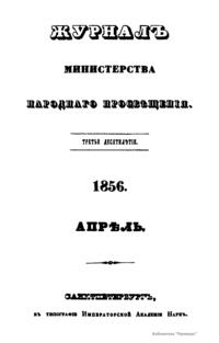 Журнал Министерства народного просвещения выходил с 1834-го по 1917 год. Официальный периодический журнал об успехах просвещения в России. Издатели журнала уверены в том, что «если для каждого человека необходим выход из грубой тьмы невежества и беспрерывное дальнейшее движение к свету, то для народов необходимо попечительное участие правительства в образовании. Только правительство имеет все средства знать и высоту успехов всемирного образования, и настоящие нужды Отечества».