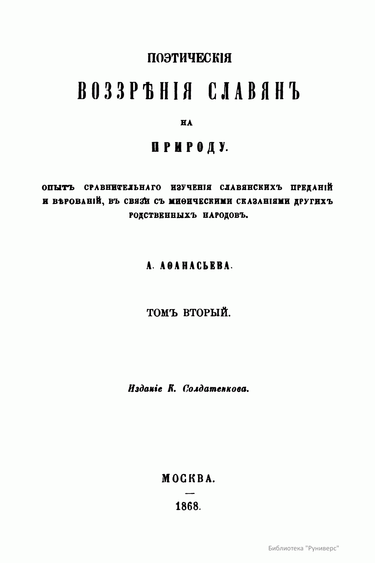 Поэтическiя воззрѣнiя славянъ на природу. Опытъ сравнительнаго изученiя славянскихъ преданiй и вѣрованiй, въ связи съ миѳическими сказанiями другихъ родственныхъ народовъ. Том вторый