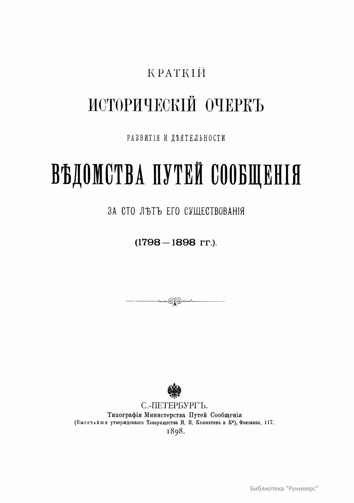 Краткiй историческiй очеркъ развитiя и дѣятельности вѣдомства путей сообщенiя за сто лѣтъ его существованiя (1798-1898 гг.)