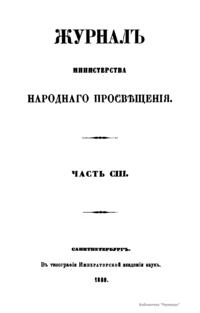 Журнал Министерства народного просвещения выходил с 1834-го по 1917 год. Официальный периодический журнал об успехах просвещения в России. Издатели журнала уверены в том, что «если для каждого человека необходим выход из грубой тьмы невежества и беспрерывное дальнейшее движение к свету, то для народов необходимо попечительное участие правительства в образовании. Только правительство имеет все средства знать и высоту успехов всемирного образования, и настоящие нужды Отечества».