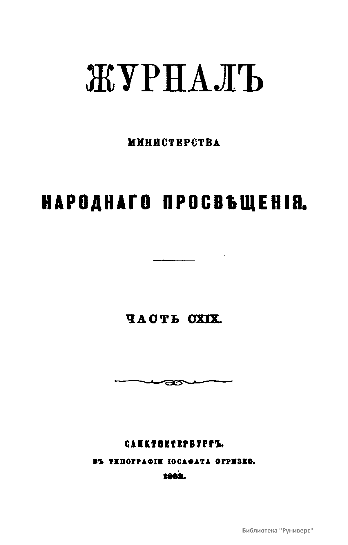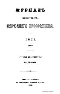 Журнал Министерства народного просвещения выходил с 1834-го по 1917 год. Официальный периодический журнал об успехах просвещения в России. Издатели журнала уверены в том, что «если для каждого человека необходим выход из грубой тьмы невежества и беспрерывное дальнейшее движение к свету, то для народов необходимо попечительное участие правительства в образовании. Только правительство имеет все средства знать и высоту успехов всемирного образования, и настоящие нужды Отечества».