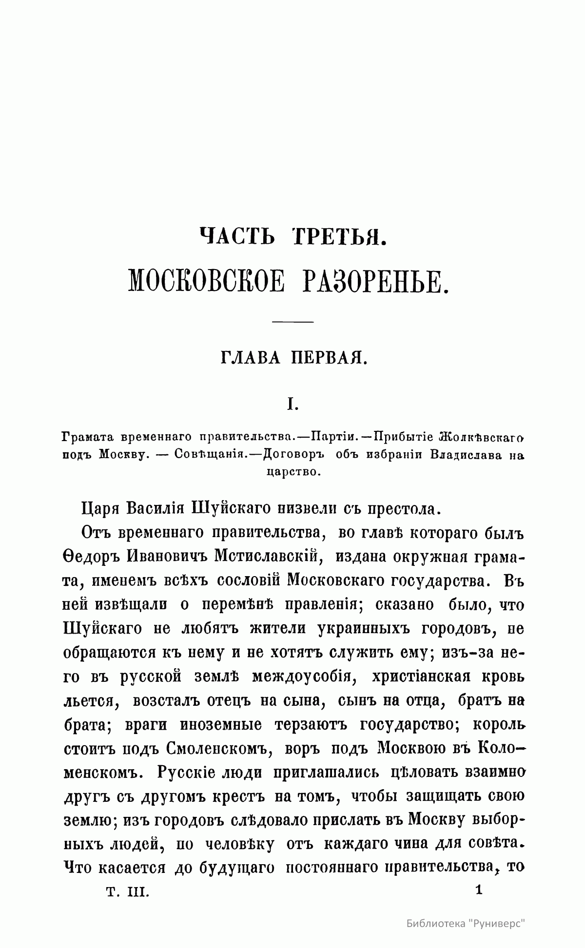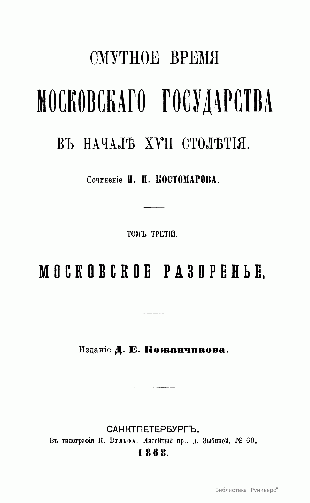 Перед читателем прижизненное издание трудов Н. И. Костомарова, в котором удачно соединялись историк-мыслитель и художник, что обеспечило ему не только одно из первых мест в ряду русских историков, но и наибольшую популярность среди читающей публики. Глубоко вдумываясь, почти вживаясь в изучаемую им старину, он воспроизводил ее в своих работах такими яркими красками, в таких выпуклых образах, что она надолго оставалась в памяти читателя. В первых трех томах и в двенадцатом томе опубликованы различные статьи. 1 – «Мысли о федеративном начале древней Руси»; «Черты народной южнорусской истории»; «Две русские народности»; «Мистическая повесть о Нифонте. Памятник русской литературы»; «Легенда о кровосмесителе»; «О значении Великого Новгорода»; «Должно ли считать Бориса Годунова основателем крепостного права?»; «Великорусские религиозные вольнодумцы в XVI веке. – Матвей Башкин и его соучастник Феодосий Косой»; «Иван Сусанин. Историческое исследование». 2 – «Иван Свирговский, украинский казацкий гетман XVI века»; «Гетманство Выговского»; «Бунт Стеньки Разина»; «По поводу мыслей светского человека, о книге «Сельское духовенство». 3 – «Куликовская битва»; «Ливонская война»; «Южная Русь в конце XVI века»; «Литовская народная поэзия»; «Об отношении русской истории к географии и этнографии». 12 – «Начало единодержавия в Древней Руси»; «Гетманство Юрия Хмельницкого»; «Церковно-историческая критика в XVII веке»; «История раскола у раскольников»; «Воспоминания о молоканах». Четвертый, пятый и шестой тома посвящены Смутному времени московского государства в начале XVII столетия. Седьмой и восьмой – истории Новгорода, Пскова и Вятки во время удельно-вечевого уклада. Девятый, десятый и одиннадцатый – Богдану Хмельницкому.