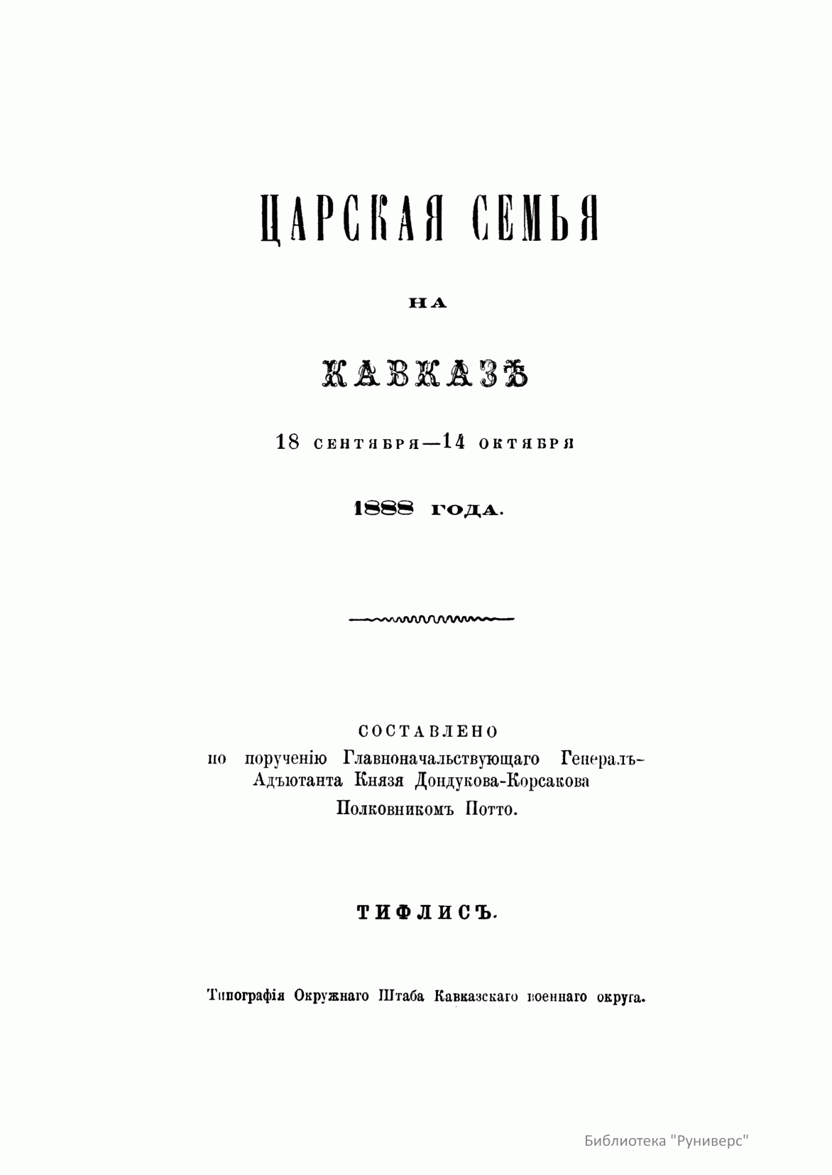 Труды выдающегося русского венного историка, генерал-лейтенанта Василия Александровича Потто (1836–1911), освещающие этапы прихода и становления русской власти в кавказском регионе, историю многолетних кавказских войн и развития казачества, обогатили русскую военную литературу и по праву считаются одними из лучших произведений кавказской тематики. Многие годы В. А. Потто собирал разрозненные документы, военные хроники и архивные материалы, чтобы отобразить общую картину драматических событий, определивших особую роль кавказских войн в истории российского государства. Издание «Царская семья на Кавказе» посвящено поездке Александра III и его семьи на Кавказ осенью 1888 г. Это путешествие имело глубокий исторический смысл, как свидетельство водворенного на Кавказе мира и воссоединения этого края с Российской империей. Рассказ об этом событии выдержан в стилистике репортажа. В хронологическом порядке описан ход поездки, населенные пункты, которые посетила императорская семья, встречи венценосных особ с местными жителями.