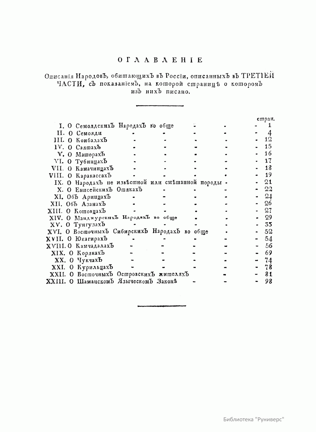 Описанiе всѣхъ обитающихъ въ Россiйскомъ государствѣ народовъ. Ихъ житейскихъ обрядовъ, обыкновенiй, одеждъ, жилищъ, упражненiй, забавъ, вѣроисповѣданiй и другихъ достопамятностей. Часть третiя о народахъ семоядскихъ, манджурскихъ и восточныхъ сибирскихъ какъ и о Шаманскомъ законѣ