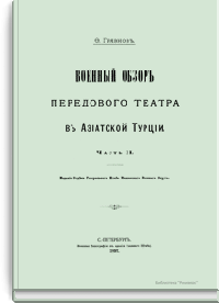 «Военный обзор передового театра в Азиатской Турции» составлен полковником Генерального штаба Ф. Ф. Грязновым по особому поручению. Книга издана в двух частях в 1895–1897 годах отделом Генерального штаба и штабом Кавказского военного округа, первая часть напечатана в Тифлисе, вторая — в Санкт-Петербурге. Обзор включает данные из компетентных русских и иностранных источников по географии, статистике и топографии района. Все сведения дополнены заметками автора, снявшего за период 1890–1892 годов 7500 верст маршрутной съемки по наиболее важным с военной точки зрения и наименее исследованным направлениям. Разведка была произведена им под прикрытием, он обследовал район в качестве пеших прогулок как надворный советник и вице-консул России в Армении. Двухтомник представляет собой военный обзор Армянского театра, как наиболее значимого для России, непосредственно прилегающего к Кавказско-Турецкой границе. Здесь представлено подробное описание и оценка его границ, орографии, гидрографии, климата, населения, экономики страны, путей сообщения, почтовых и телеграфных линий, а также краткий стратегический очерк операционных направлений от границы Закавказья в пределах рассматриваемого района. К первой части приложена цветная схема направлений, пройденных и снятых маршрутной съемкой.