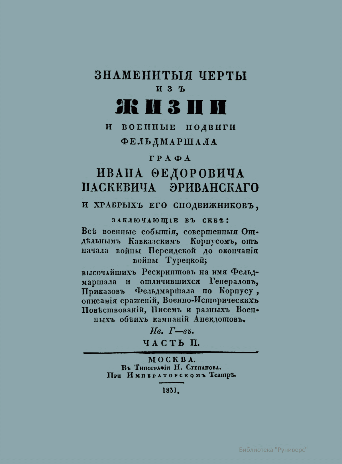 Знаменитыя черты изъ жизни и военные подвиги фельдмаршала графа Ивана ѳедоровича Паскевича-Эриванскаго. Часть II