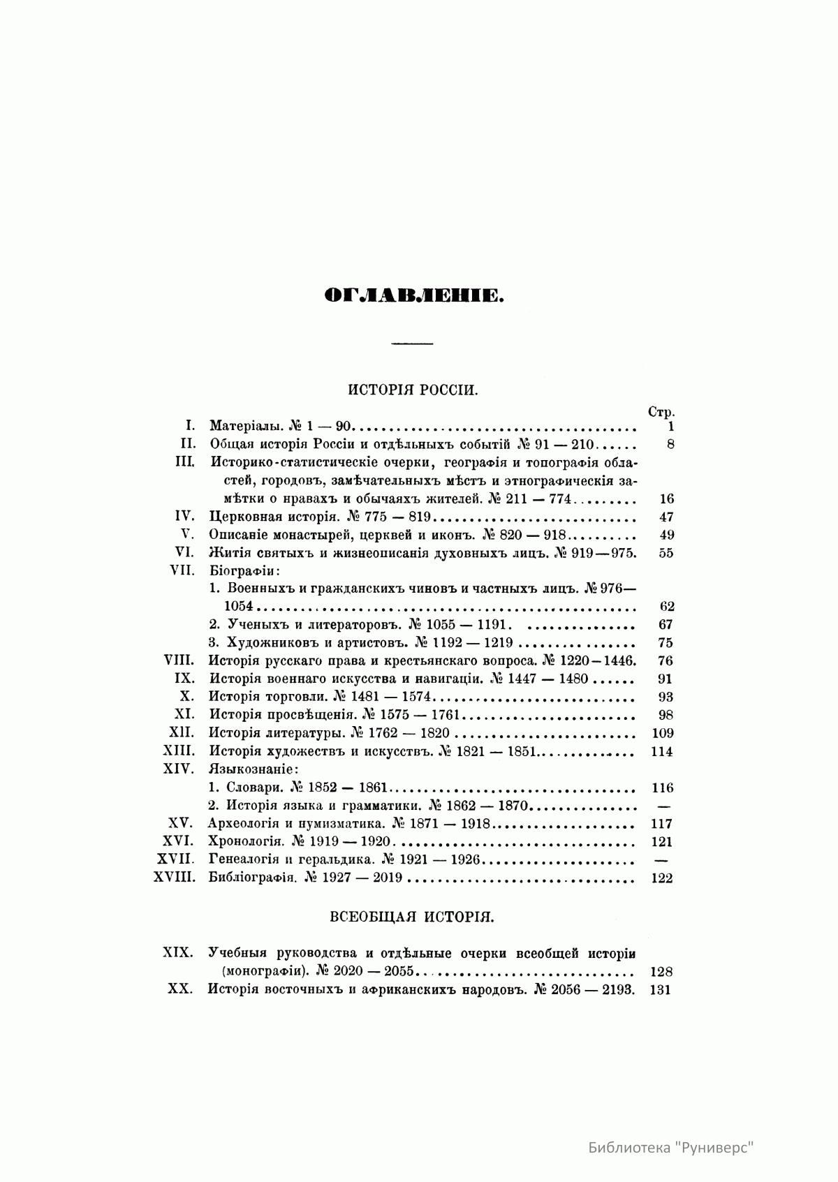 В десяти томах «Русской исторической библиографии» заключается описание свыше 44 000 книг, карт, периодических изданий, статей из журналов и газет по русской и всеобщей истории. Кроме этого, богато представлена литература о Крымской войне 1853–1856 гг., реформе 1860-х гг., польском восстании 1863–1864 гг. и о других событиях.