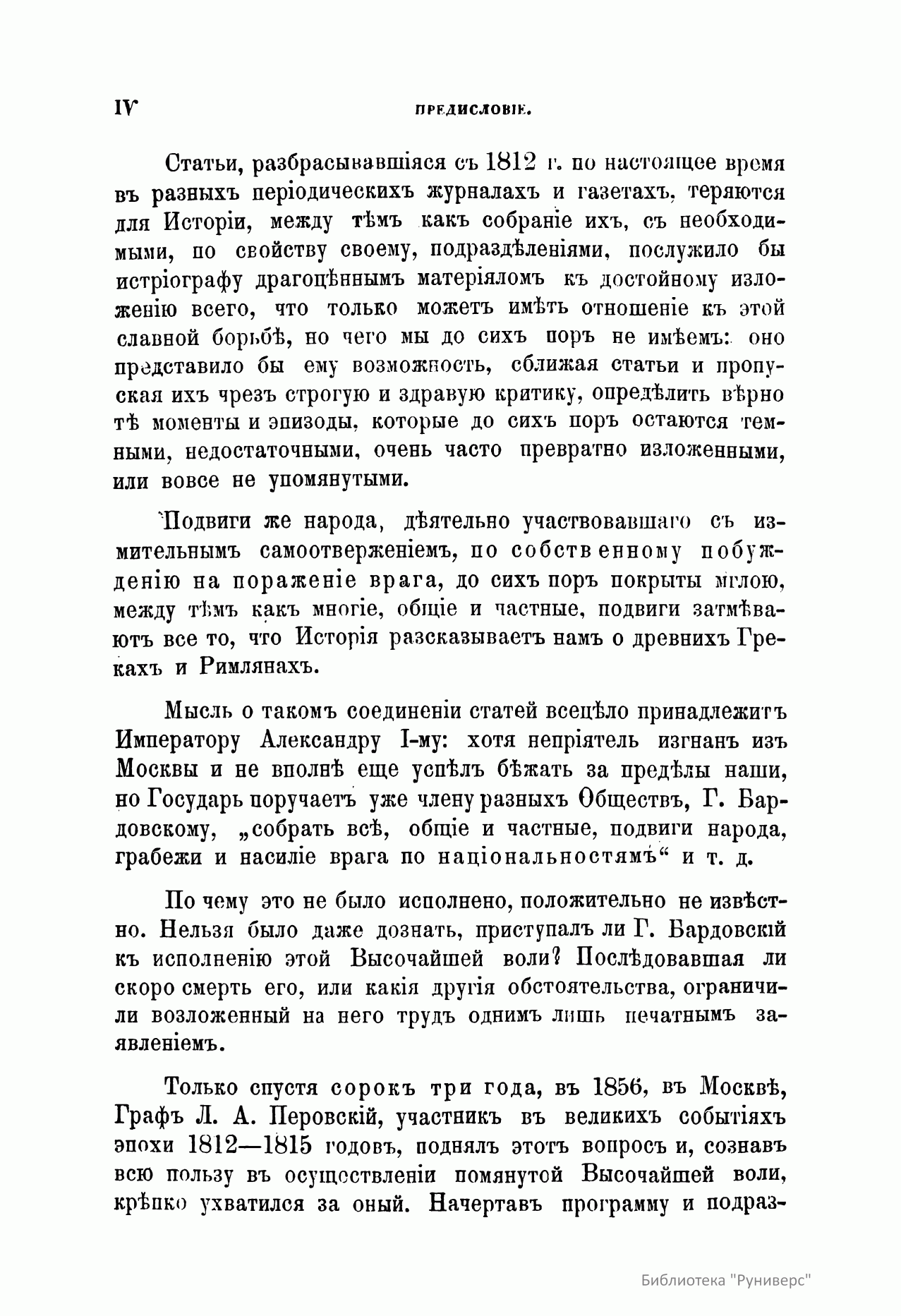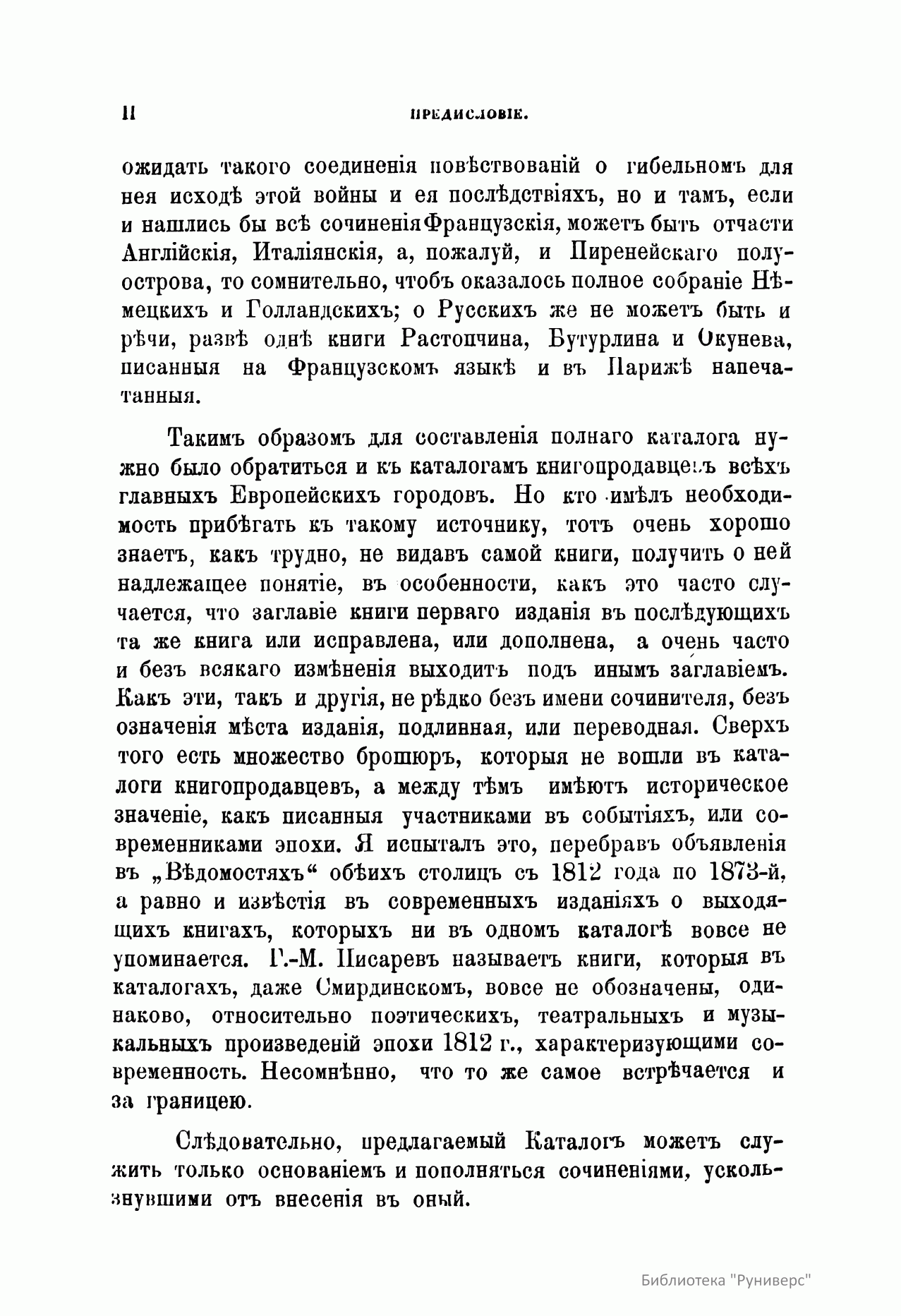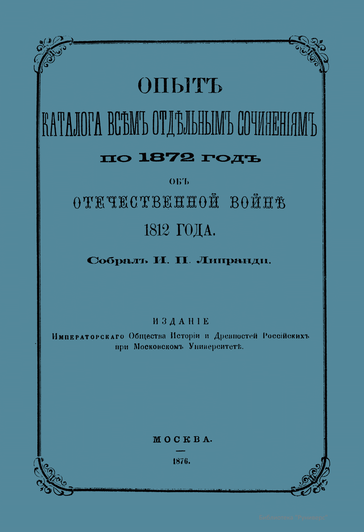 Настоящий каталог – издание Общества истории и древностей российских при Московском университете. Он включает перечень 394 русских и 680 иностранных печатных сочинений об Отечественной войне 1812 года, изданных до 1872 года, и является ценным пособием для историографа.