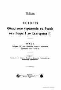 «История областного управления в России от Петра I до Екатерины II» — докторская диссертация приват-доцента кафедры русской истории Московского университета Ю. В. Готье, которую он защитил в 1913 году. Труд был настолько объемным, что в этом же году Императорским обществом истории и древностей российских был издан только первый том. Второй том, доработанный академиком Ю. В. Готье, вышел в издательстве Академии наук СССР в 1941 году. Преподавателями ученого в Московском университете были известные историки П. Г. Виноградов, В. О. Ключевский, оказавшие значительное влияние на развитие его научно-исторических взглядов. В предисловии к изданию автор ссылается на консультации с В. О. Ключевским по некоторым вопросам, затронутым в книге. В работе использованы документы из архива Министерства юстиции и Государственного архива в Санкт-Петербурге. Первый том содержит историю реформы 1727 года и областного деления от этого времени до 1775 года, исследование организации областных учреждений и их деятельности. Описание дополнено таблицами и иллюстрациями, в конце текста даются три цветные карты европейской России по различным периодам. Второй том посвящен надзору за областным управлением, экстренным учреждениям и их роли в историческом процессе в XVIII столетии. В приложении помещены: указы и правительственные распоряжения, не вошедшие в «Полное собрание законов»; «Наставление частной комиссии о порядке государства в силе общего права» Екатерины II; поправки и дополнения к первому тому.