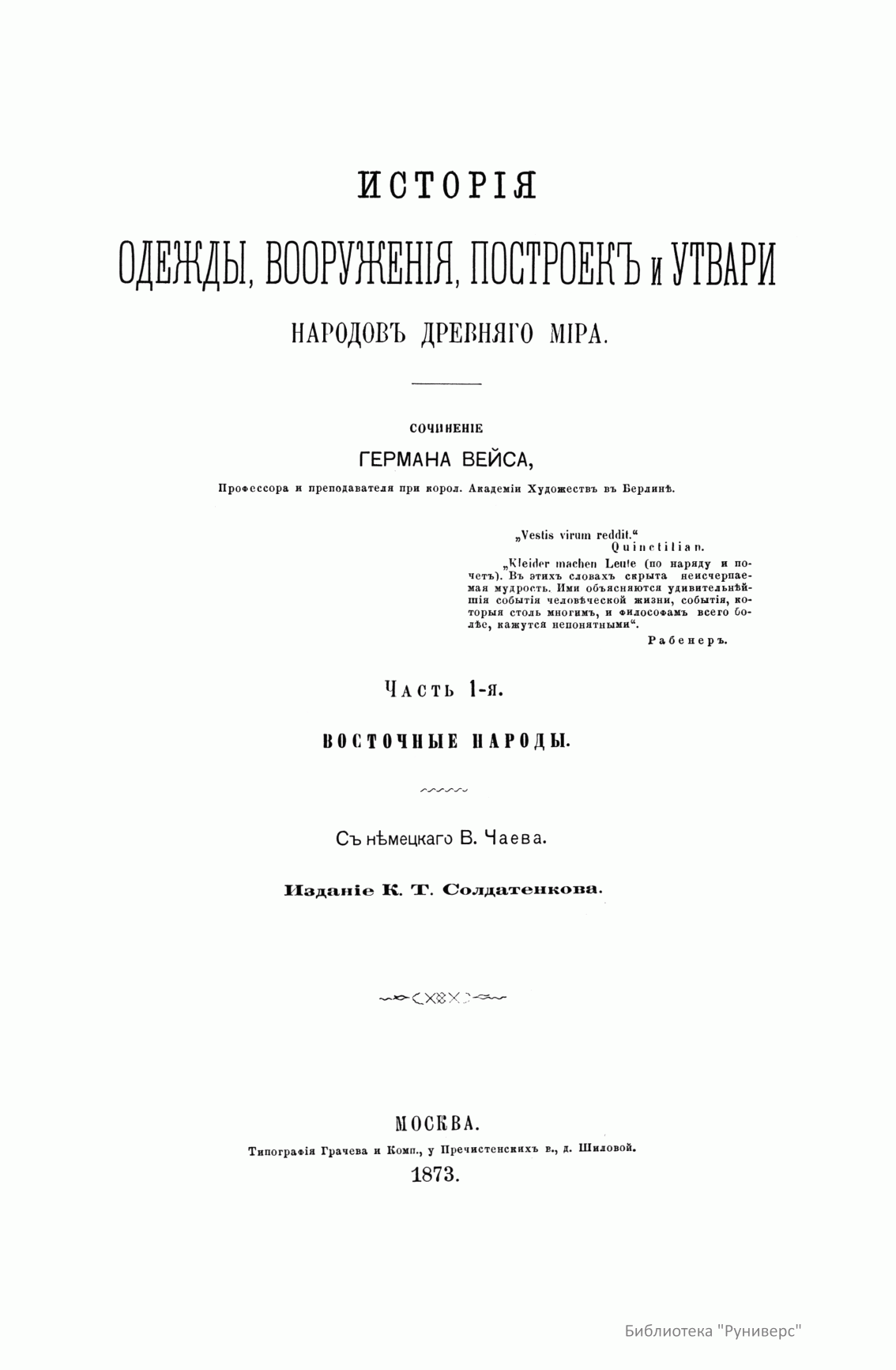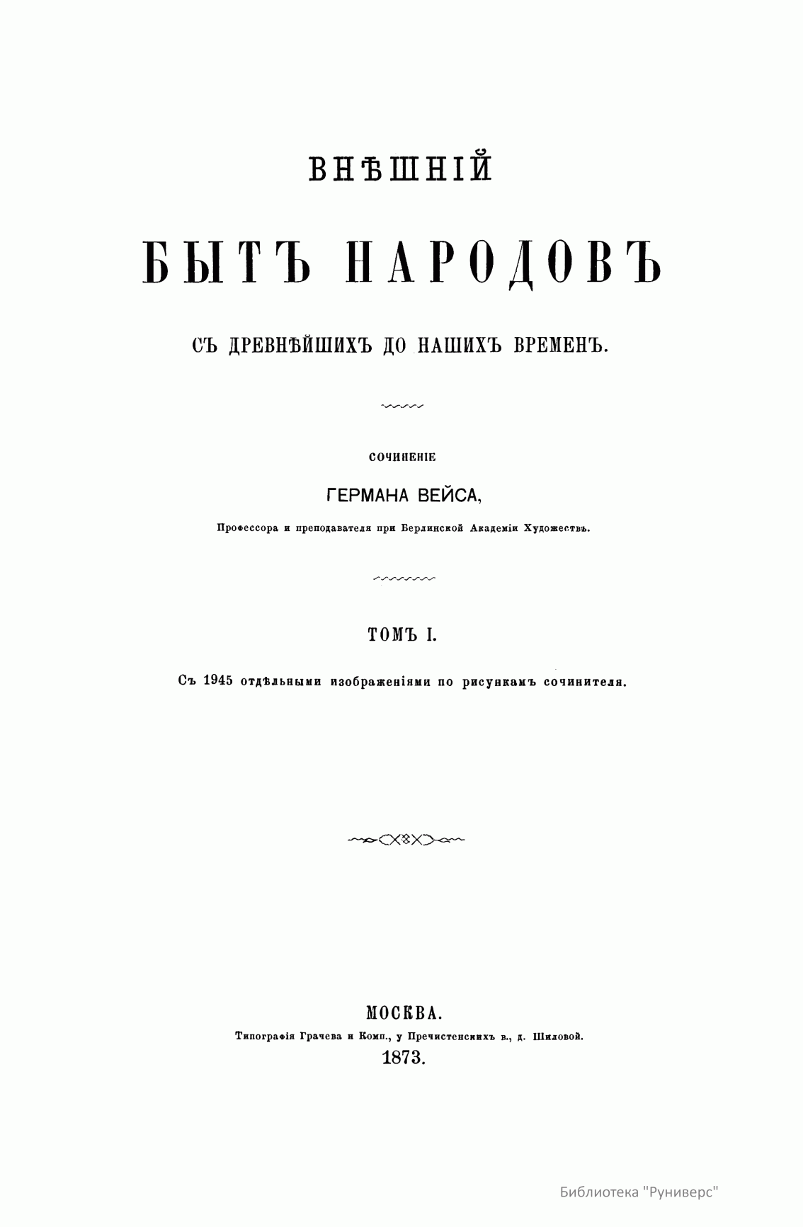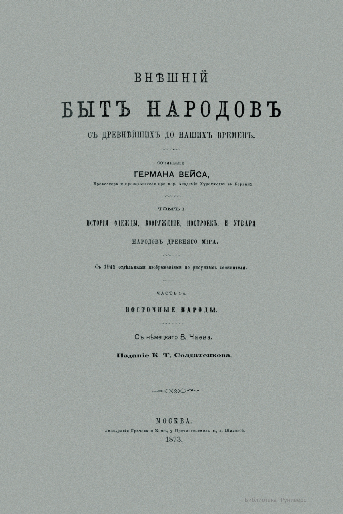Сочинение Германа Вейса, профессора и преподавателя Берлинской Академии художеств, адресовано прежде всего художникам, а также всем интересующимся историей культуры разных народов. Книга состоит из трех частей. Первый том посвящен древнему миру (Часть первая – восточные народы: древние народы Африки (египтяне, эфиопяне), древние народы Азии (аравитяне, народы западной Азии, ассирияне и вавилоняне, мидяне и персы, евреи и финикияне, малоазийские народы, индусы, Китай). Часть вторая – западные народы: древнейшие народы Европы (народы северовосточной Европы, народы европейской Сарматии, народы северной, средней и западной Европы, народы Испании, народы Греции, народы Италии). Второй том посвящен средним векам до начала XIV столетия (Часть первая – Византия и Восток. Часть вторая – европейские народы). Третий том продолжен до второй половины XIX века (Часть первая – от XIV до XVI столетия. Часть вторая – с XVI столетия). Все содержание внешнего быта автор распределяет по трем рубрикам: одежда и вооружение, постройки, утварь (постройки рассматриваются только в первом томе, одежда и вооружение в немецком языке определяются одним словом, которому нет аналога в русском, – die Tracht). Автор придает своим рубрикам очень широкий объем. В первую рубрику кроме вооружения вместе с уборами и украшениями входит и убранство волос, и косметические средства. Вторая, «постройки», охватывает не только всякого рода здания, но и мосты, дороги, каналы, судостроение, военный стан – все то, к чему можно приложить понятие «постройки». Еще шире третья рубрика – «утварь». В нее входят боевые колесницы, осадные машины, сосуды, мебель, храмовая утварь, музыкальные инструменты, игральные приборы и пр. В книге представлены копии рисунков, сделанных автором с самых лучших и достоверных источников без малейших отступлений.