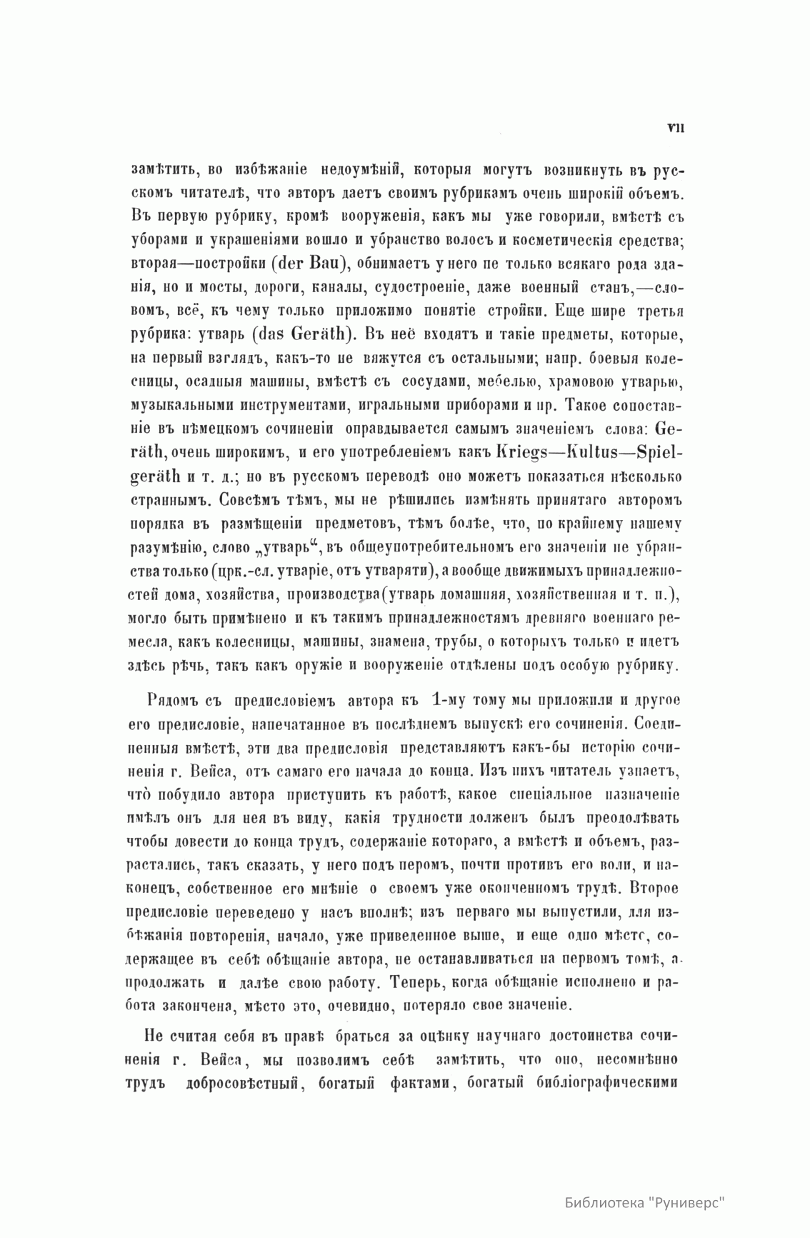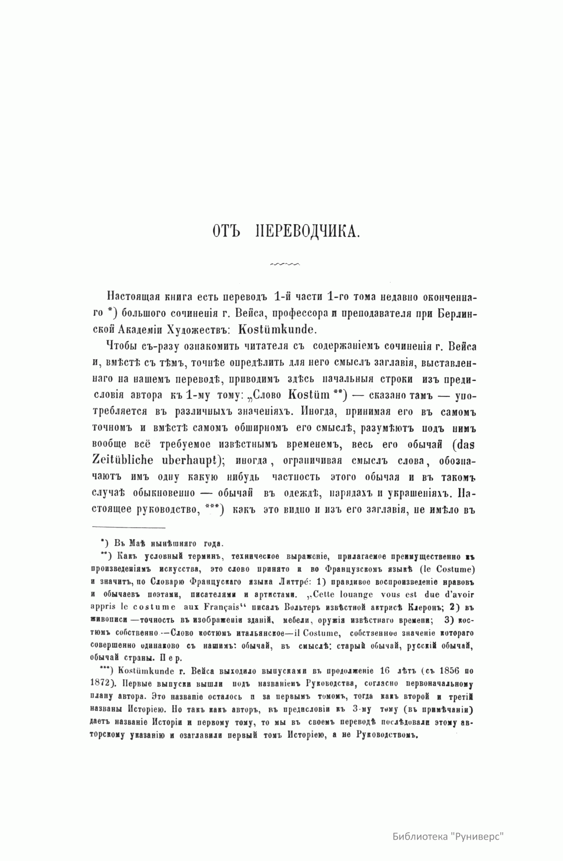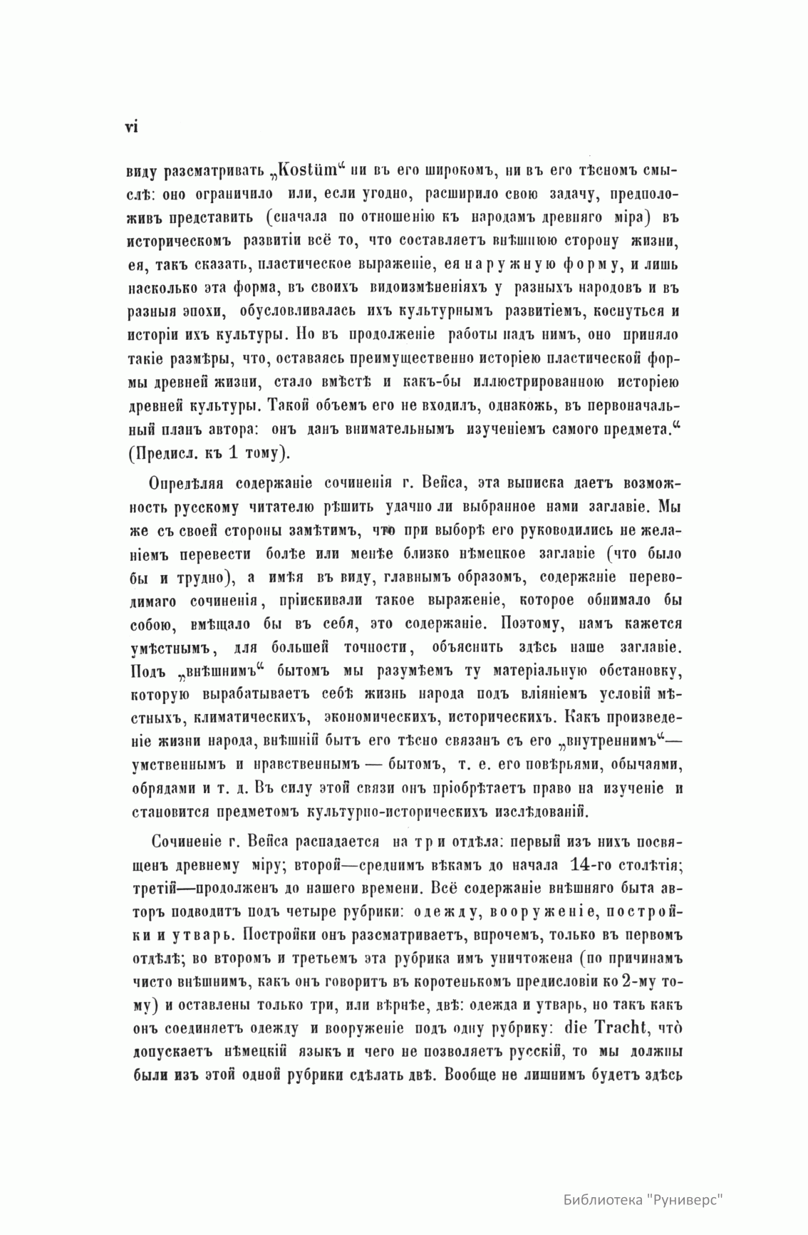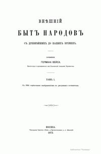 Сочинение Германа Вейса, профессора и преподавателя Берлинской Академии художеств, адресовано прежде всего художникам, а также всем интересующимся историей культуры разных народов. Книга состоит из трех частей. Первый том посвящен древнему миру (Часть первая – восточные народы: древние народы Африки (египтяне, эфиопяне), древние народы Азии (аравитяне, народы западной Азии, ассирияне и вавилоняне, мидяне и персы, евреи и финикияне, малоазийские народы, индусы, Китай). Часть вторая – западные народы: древнейшие народы Европы (народы северовосточной Европы, народы европейской Сарматии, народы северной, средней и западной Европы, народы Испании, народы Греции, народы Италии). Второй том посвящен средним векам до начала XIV столетия (Часть первая – Византия и Восток. Часть вторая – европейские народы). Третий том продолжен до второй половины XIX века (Часть первая – от XIV до XVI столетия. Часть вторая – с XVI столетия). Все содержание внешнего быта автор распределяет по трем рубрикам: одежда и вооружение, постройки, утварь (постройки рассматриваются только в первом томе, одежда и вооружение в немецком языке определяются одним словом, которому нет аналога в русском, – die Tracht). Автор придает своим рубрикам очень широкий объем. В первую рубрику кроме вооружения вместе с уборами и украшениями входит и убранство волос, и косметические средства. Вторая, «постройки», охватывает не только всякого рода здания, но и мосты, дороги, каналы, судостроение, военный стан – все то, к чему можно приложить понятие «постройки». Еще шире третья рубрика – «утварь». В нее входят боевые колесницы, осадные машины, сосуды, мебель, храмовая утварь, музыкальные инструменты, игральные приборы и пр. В книге представлены копии рисунков, сделанных автором с самых лучших и достоверных источников без малейших отступлений.