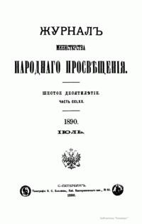 Журнал Министерства народного просвещения выходил с 1834-го по 1917 год. Официальный периодический журнал об успехах просвещения в России. Издатели журнала уверены в том, что «если для каждого человека необходим выход из грубой тьмы невежества и беспрерывное дальнейшее движение к свету, то для народов необходимо попечительное участие правительства в образовании. Только правительство имеет все средства знать и высоту успехов всемирного образования, и настоящие нужды Отечества».