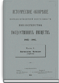 Министерство государственных имуществ возникло в 1837 г. по воле императора Николая I. Главная задача министерства заключалась в установлении попечительства над государственными крестьянами и лучшее устройство государственного имущества, то есть казенных земель и лесов, которые с 1811 г. вместе с казенными крестьянами состояли в ведении министерства финансов по департаменту государственных имуществ. Под влиянием неурожаев начала 30-х годов министерству было поручено также заведывание всеми делами, относящимися к усовершенствованию сельского хозяйства. В 1874 г. из министерства финансов министерству государственных имуществ передано горное дело. В ведении этого министерства два раза, с 1848-го по 1856-й и с1874-го по 1881 гг., находилось государственное коннозаводство. «Историческое обозрение пятидесятилетней деятельности Министерства государственных имуществ» (1837 – 1887) знакомит читателя с главными результатами деятельности этой организации. «Обозрение» разделено на пять частей. Первая часть посвящена учреждению Министерства государственных имуществ и преобразованиям, которым оно подвергалось с 1837-го до 1887 г. Вторая часть состоит из двух отделов: в первом излагаются главные результаты попечительства министерства над свободными сельскими жителями, во втором – результаты поземельного устройства государственных крестьян. Третья часть также разделена на два отдела: в первом излагаются результаты управления казенными землями и оброчными статьями, во втором – результаты управления казенными лесами. Четвертая часть также включает два отдела: первый отдел посвящен результатам заведования министерством сельскохозяйственной частью, второй – управлению государственным коннозаводством. В пятой части излагаются результаты заведывания горным делом. Главными материалами для «Обозрения» кроме текущих и архивных дел министерства послужили всеподданнейшие отчеты министров государственных имуществ, а также некоторые печатные источники.