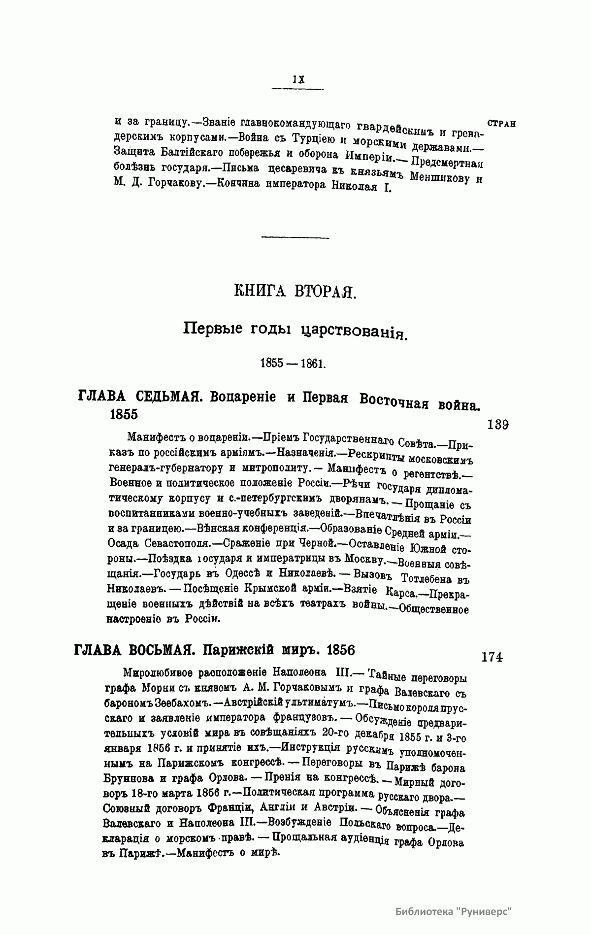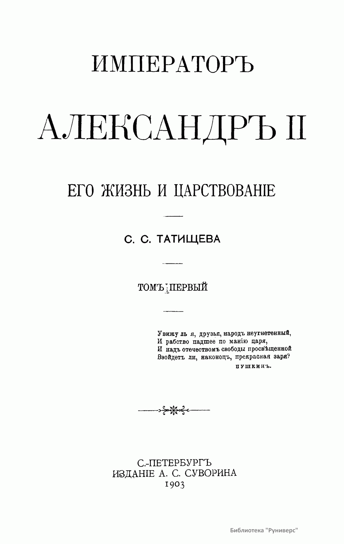 Александр II (1818 – 1881) – российский император с 1855 г. Старший сын Николая I. В 1861 г. в значительной степени благодаря его последовательности был устранен корень всех зол, терзавших Россию, – многовековое крепостное право, затем подготовлен и проведен целый комплекс реформ: судебная, земская и многие другие, открывавшие путь к созданию нового, более прогрессивного государственного устройства. В царствование Александра II завершилось присоединение к России Кавказа (1864), Казахстана (1865), большей части Средней Азии (1865 –1881). На жизнь Александра II был совершен ряд покушений (1866, 1867, 1879, 1880), убит народовольцами. Автор настоящего фундаментального труда Татищев Сергей Спиридонович видит свою задачу в том, «чтобы собрать воедино многочисленные свидетельства об отдельных моментах и эпизодах жизни и деятельности государя Александра Николаевича и, дополнив их собственными изысканиями, составить точный и по возможности полный прагматический свод событий его царствования и личного в них участия или воздействия на них императора в области политики как внутренней, так и внешней». В основание своей работы автор положил материалы, изученные им в Государственном и Главном Санкт-Петербургском архиве министерства иностранных дел, в архивах Государственного совета, бывшего III отделения Собственной Его Величества канцелярии, в Военно-ученом архиве Главного штаба. Кроме того, автор имел доступ в некоторые архивы иностранных государств и частные архивы.