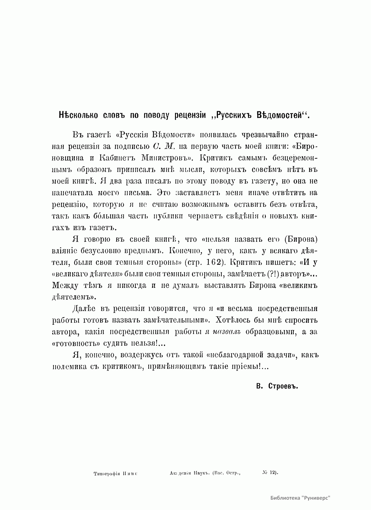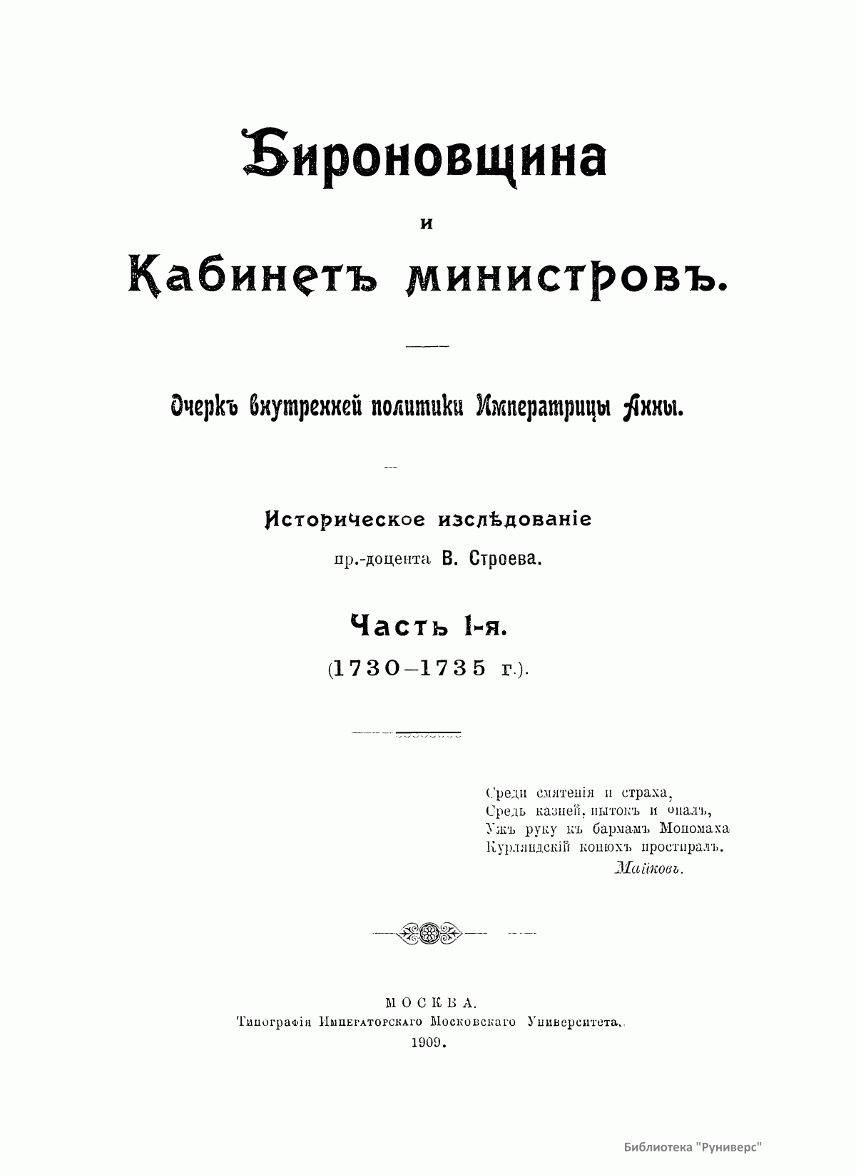 Эрнест-Иоанн Бирон (1690 – 1772), граф, фаворит императрицы Анны Иоанновны, герцог Курляндский (с 1737). Играл роль верховного владыки во все царствование императрицы (1730 – 1740). После ее смерти был несколько недель регентом за малолетством только что родившегося Иоанна Антоновича, объявленного императором Российской империи. После дворцового переворота в 1740 г. арестован и сослан. Помилован и возвращен в Петербург императором Петром III. Время правления Бирона заклеймено в истории именем «Бироновщина». Почти все современники Бирона и большинство позднейших историков считали время Анны Иоанновны вследствие господства Бирона самым бедственным временем для русского государства: засилье иностранцев, разграбление богатств страны, всеобщая подозрительность, шпионаж, доносы, жестокое преследование недовольных. Тем не менее, по словам автора настоящего издания В. Строева, «влияние Бирона нельзя назвать безусловно вредным». Автор в качестве эпиграфа использует слова А.С. Пушкина из письма к Лажечникову: «Он (Бирон) имел несчастие быть немцем. На него свалили весь ужас царствования Анны, которое было в духе его времени и в нравах народа». Историческое исследование В. Строева посвящено подробному анализу внутренней политики Анны Иоанновны. Автор доказывает, что кабинет министров до 1735 г. резко отличается от этого учреждения после 1735 г. Первая часть издания освещает события с 1730-го по 1735 г. Вторая часть посвящена кабинету министров после 1735 г.
