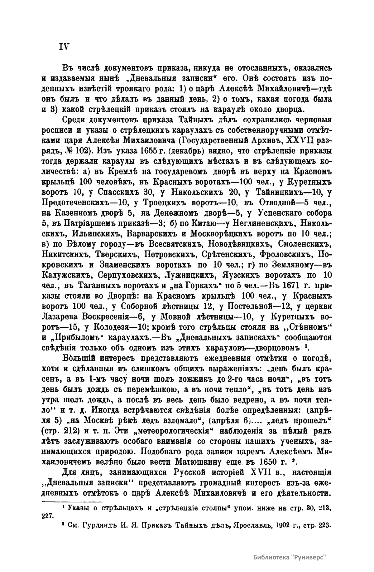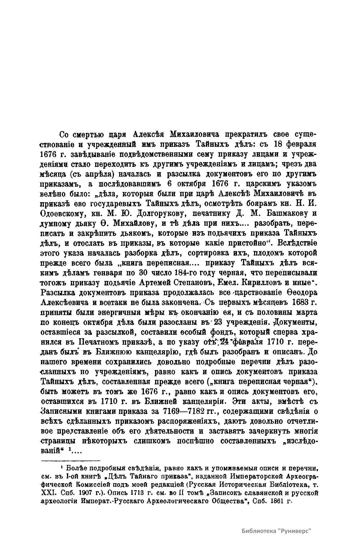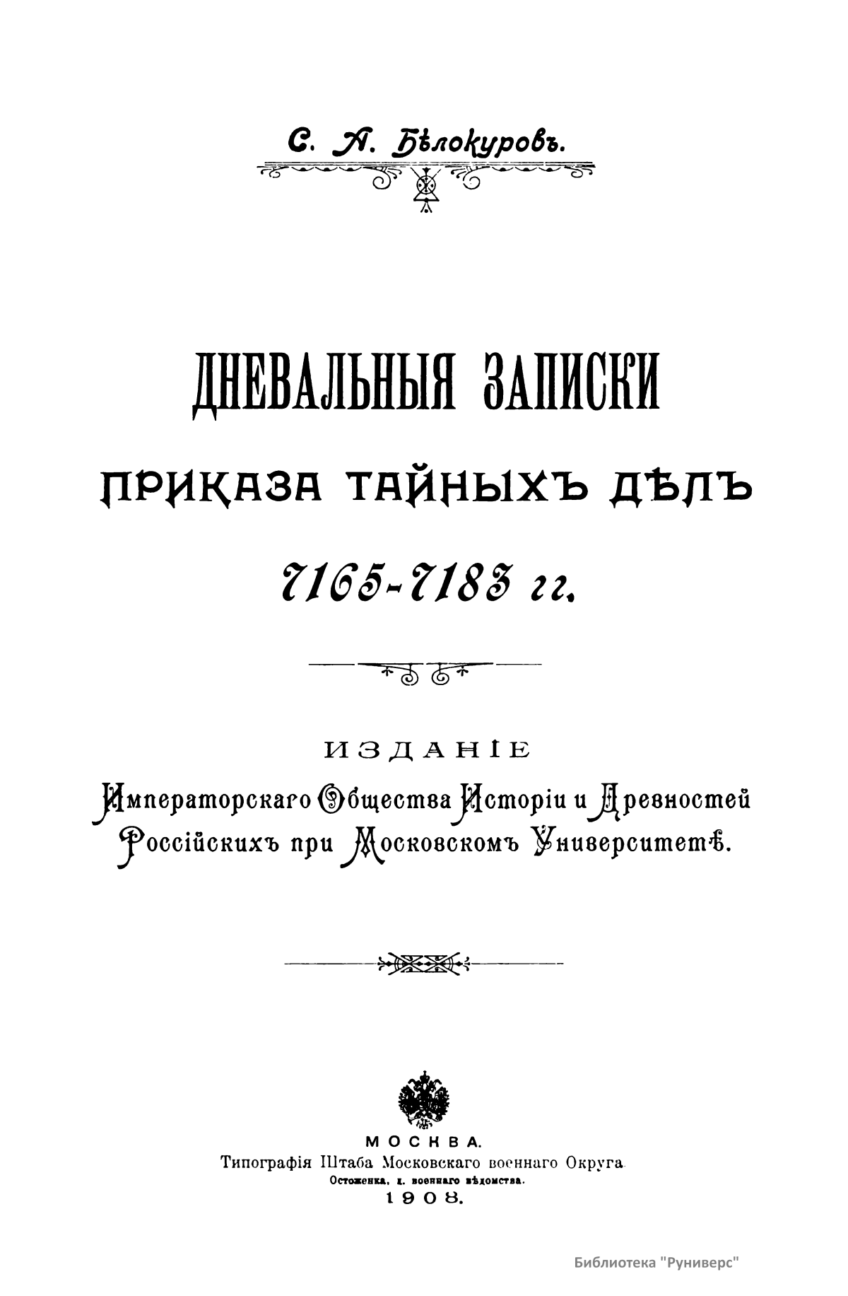 Приказ тайных дел, или тайный приказ, был учрежден около 1658 г. царем Алексеем Михайловичем и являлся как бы собственной канцелярией царя. В нем заседали дьяк и человек 10 подьячих. Бояре и думные люди не входили в состав приказа, так как он был учрежден главным образом для наблюдения за их деятельностью. Подьячие приказа тайных дел посылались с послами в разные государства и на посольские съезды, а также с воеводами на войну. Они должны были следить за действиями послов и воевод и обо всем доносить царю. В приказе тайных дел производились следствия по важнейшим государственным делам, ведались мастера гранатного дела, само гранатное дело и заводы. В ведении этого же приказа состояла любимая царская потеха – птицы, кречеты и ястребы, с особым штатом для их ловли и обучения, а также голубятни, в которых было более 100 тысяч голубиных гнезд для корма хищных птиц. Приказ тайных дел был уничтожен со смертью царя Алексея Михайловича. В настоящем издании опубликованы «Дневальные записки» приказа тайных дел. Они состоят из поденных известий: 1). О царе Алексее Михайловиче – где он был и что делал в данный день. 2). О том, какая была погода. 3). Какой стрелецкий приказ стоял на карауле около дворца. Издание представляет несомненный интерес для занимающихся историей XVII века.