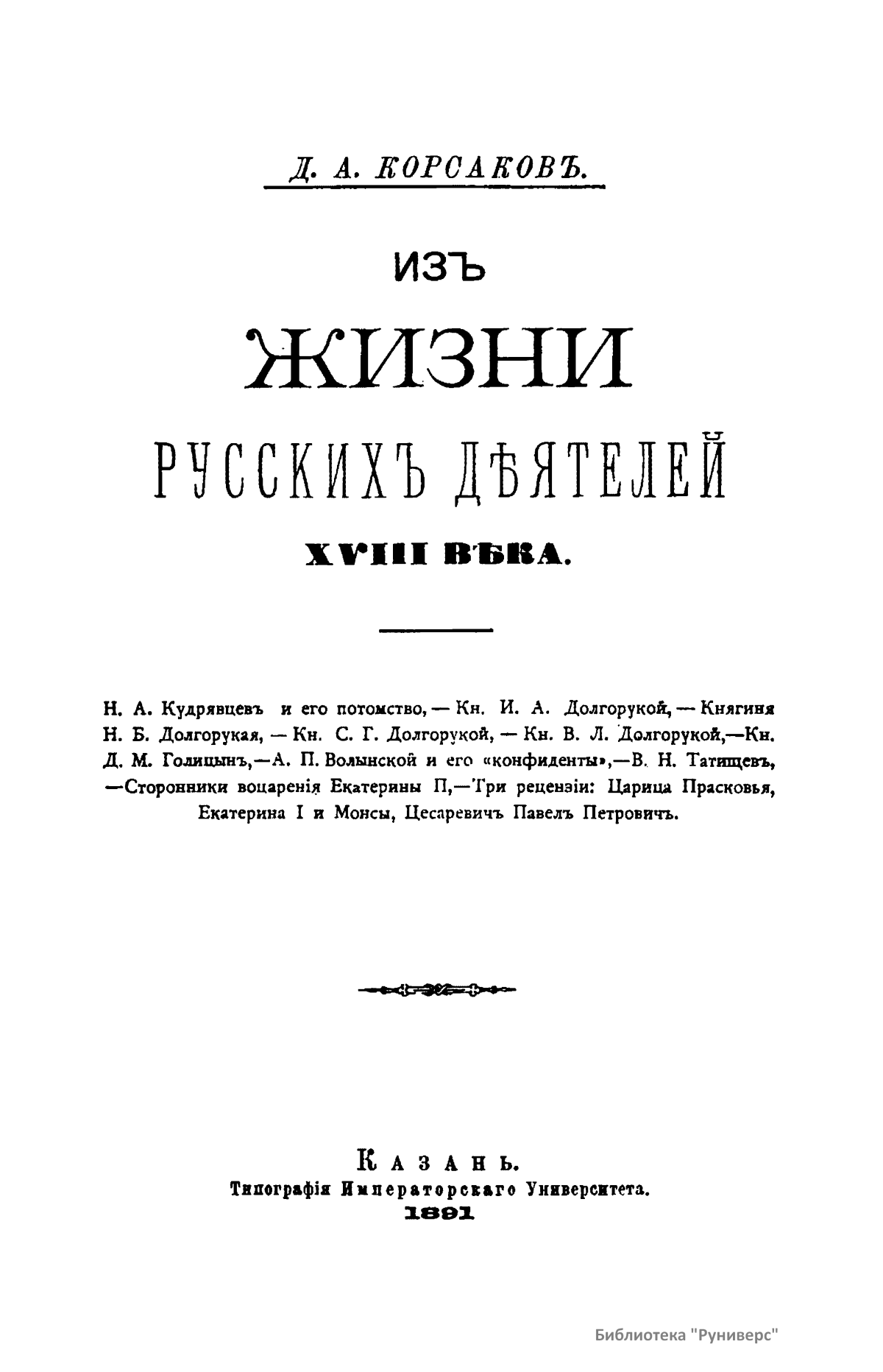Биографические очерки и эпизоды из жизни русских деятелей XVIII века относятся к периоду от кончины Петра Великого до воцарения Екатерины II – времени памятного знаменательной борьбой потомков старинной московской знати с немцами, все более и более оттеснявшими их от кормила государственного правления. Эта борьба составляет главное содержание большей части монографий, входящих в состав предлагаемого сборника. Вниманию читателя предлагаются следующие статьи: 1. Никита Алферович Кудрявцев и его потомство. 2. Князь Иван Алексеевич Долгорукой, фаворит и обер-камергер императора Петра II, (1708 – 1739). 3. Княгиня Наталья Борисовна Долгорукая, (1714 – 1771). 4. Князь Сергей Григорьевич Долгорукой и его семья в ссылке (их жизнь в Раненбурге с 1730-го по 1735 г.). 5. Ссылка князя Василия Лукича Долгорукаго в село Знаменское, (1730). 6. Суд над князем Дмитрием Михайловичем Голицыным, (1736 – 1737). 7. Артемий Петрович Волынской и его «конфиденты», (1689 – 1740). 8. Василий Никитич Татищев, (1686 – 1750). 9. Некоторые из сторонников воцарения Екатерины II, (1757 – 1762). 10. Три рецензии: 1. М. И. Семевский. Царица Прасковья. Спб., 1883. 2. М. И. Семевский. Царица Екатерина Алексеевна, Анна и Вилим Монс. Спб., 1884. 3. Д. Ф. Кобеко. Цесаревич Павел Петрович. Спб., 1883.