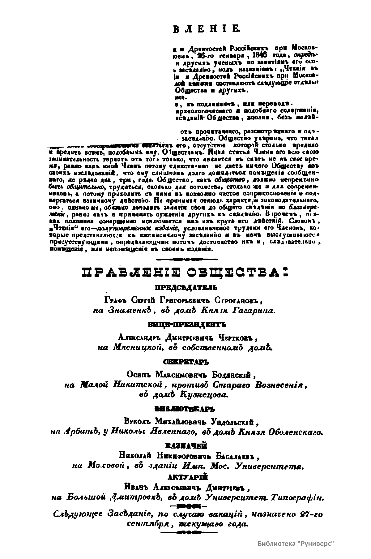 «Чтения в Императорском обществе истории и древностей российских» – периодическое издание трудов Общества. Выпускались отдельными книгами на протяжении 72 лет с десятилетним перерывом. Первая книга вышла в свет в январе 1846 г. Каждая книга состояла из четырех разделов: исторических исследований, отечественных исторических документальных материалов, иностранных материалов и смеси. Публиковались также исследования и материалы по археологии, этнографии, нумизматике, палеографии и другим дисциплинам. До июня 1848 г. было выпущено 23 книги «Чтений». В июньской книге за 1848 г. О. М. Бодянский поместил записки Дж. Флетчера о Московском государстве, что вызвало недовольство Николая I. «Чтения» были закрыты, а Бодянский удален из Московского университета. Издание «Чтений» возобновилось только в 1858 г., когда Бодянский снова стал секретарем общества. Издание приняло славянофильское направление, к прежним четырем разделам «Чтений» прибавился раздел славянских материалов. С 1858 г. «Чтения» выходили в свет четыре раза в год.