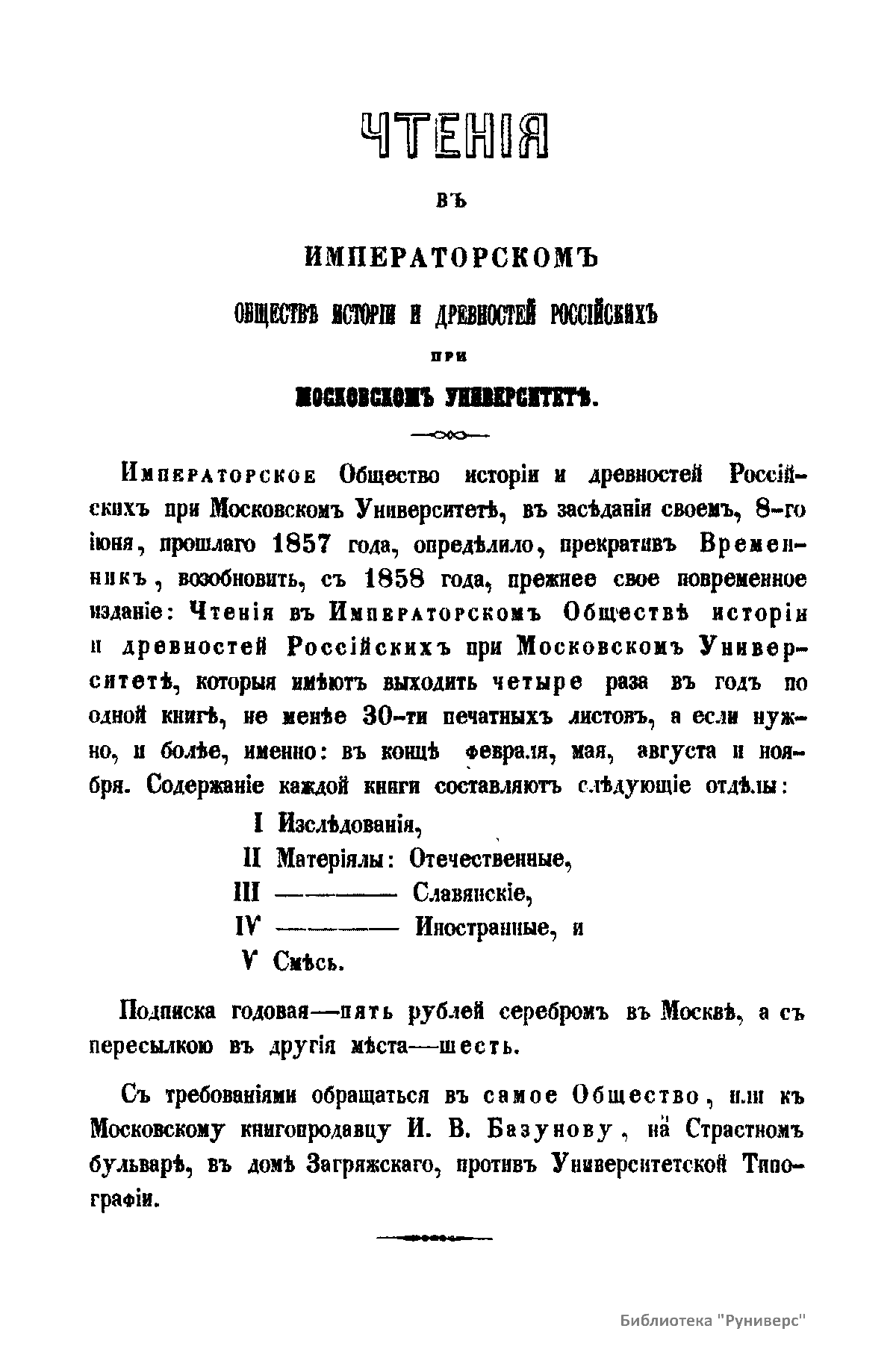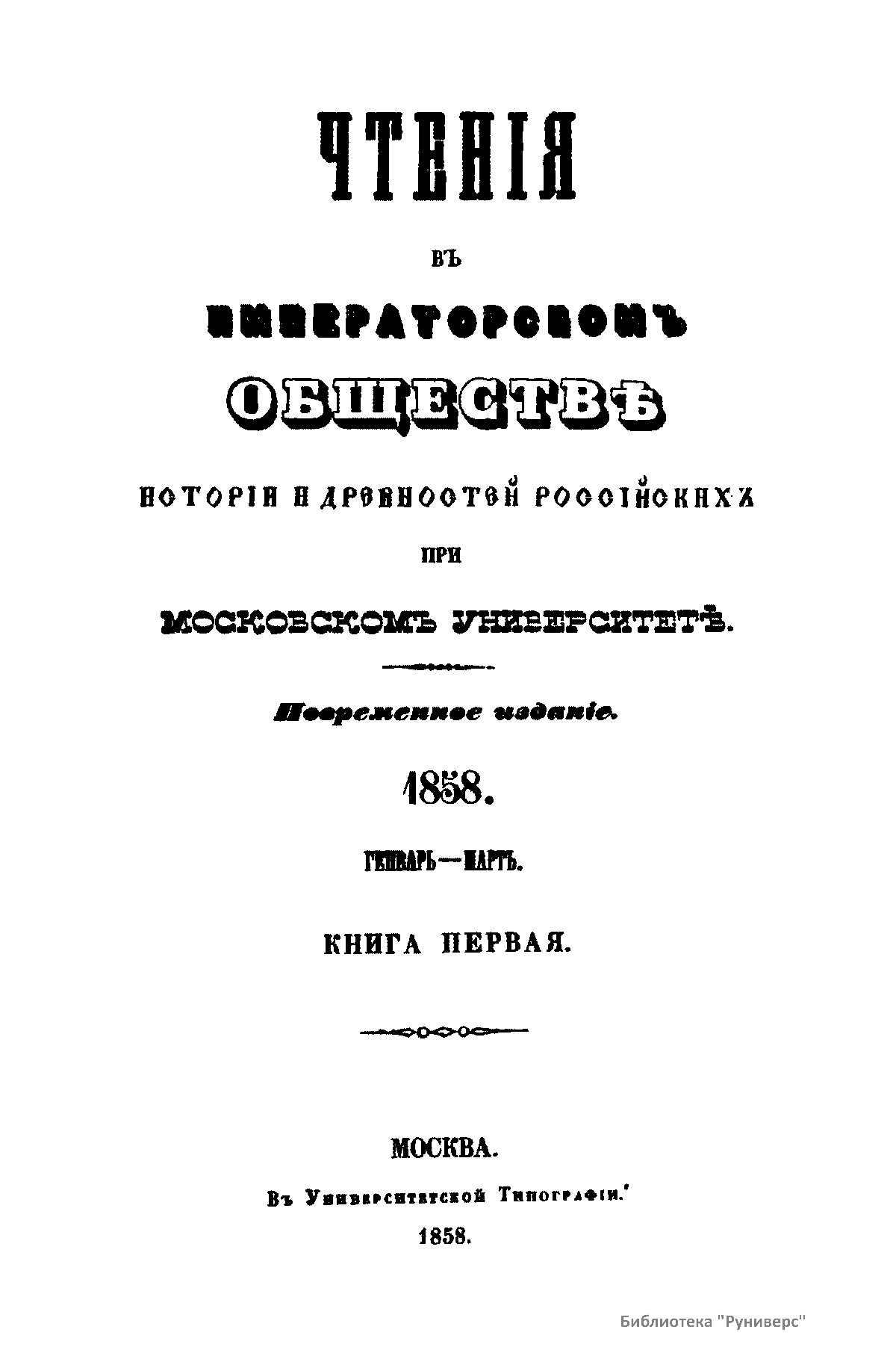 Чтенiя въ Императорскомъ Обществѣ Исторiи и Древностей Россiйскихъ при Московскомъ Университетѣ. 1858. Генварь-Мартъ. Книга первая