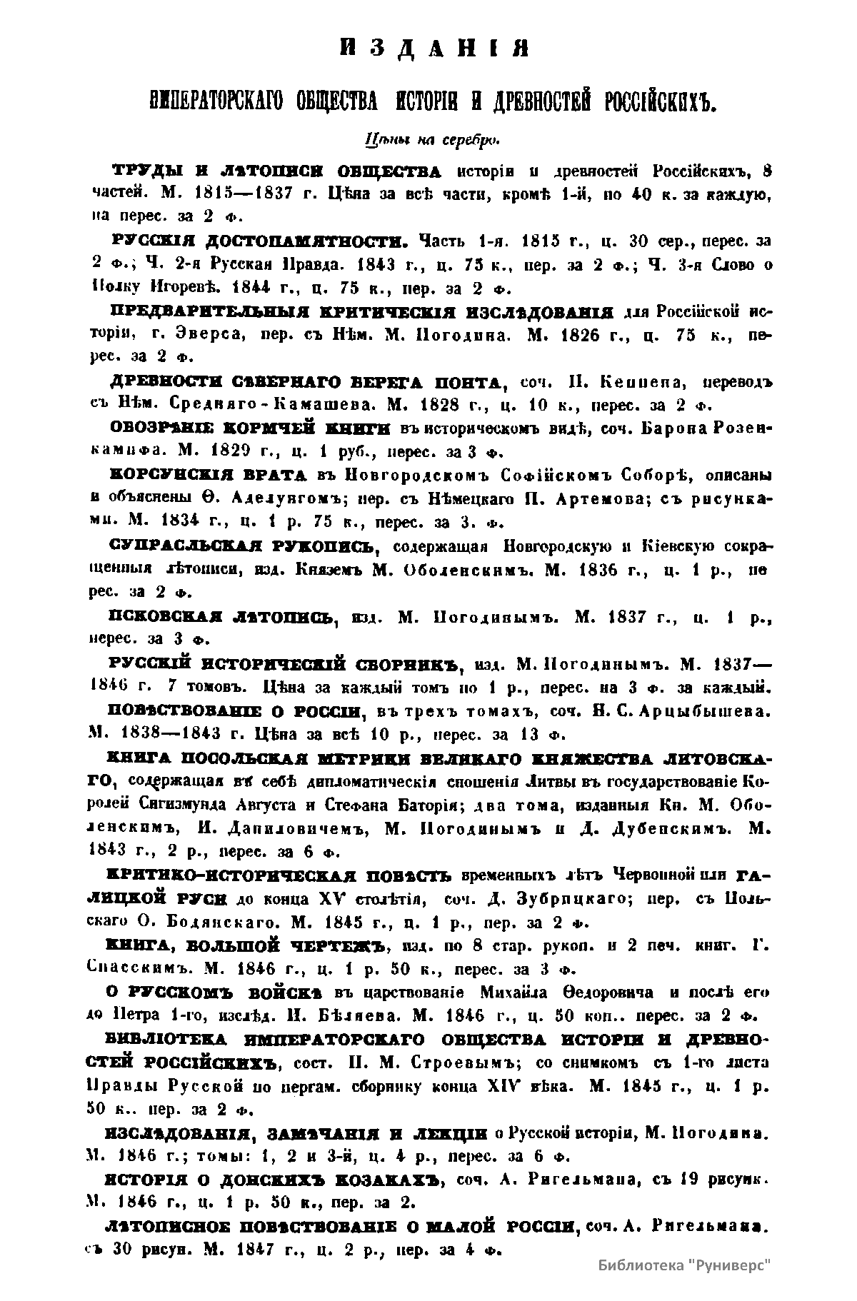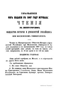 «Чтения в Императорском обществе истории и древностей российских» – периодическое издание трудов Общества. Выпускались отдельными книгами на протяжении 72 лет с десятилетним перерывом. Первая книга вышла в свет в январе 1846 г. Каждая книга состояла из четырех разделов: исторических исследований, отечественных исторических документальных материалов, иностранных материалов и смеси. Публиковались также исследования и материалы по археологии, этнографии, нумизматике, палеографии и другим дисциплинам. До июня 1848 г. было выпущено 23 книги «Чтений». В июньской книге за 1848 г. О. М. Бодянский поместил записки Дж. Флетчера о Московском государстве, что вызвало недовольство Николая I. «Чтения» были закрыты, а Бодянский удален из Московского университета. Издание «Чтений» возобновилось только в 1858 г., когда Бодянский снова стал секретарем общества. Издание приняло славянофильское направление, к прежним четырем разделам «Чтений» прибавился раздел славянских материалов. С 1858 г. «Чтения» выходили в свет четыре раза в год.