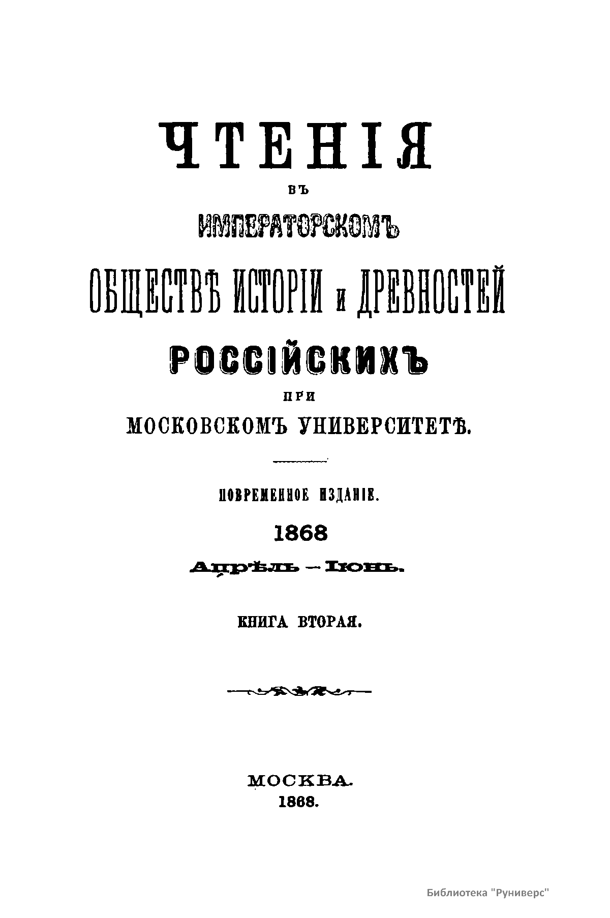 Чтенiя въ Императорскомъ Обществѣ Исторiи и Древностей Россiйскихъ при Московскомъ Университетѣ. 1868. Апрѣль-Iюнь. Книга вторая