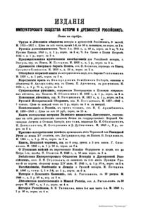 «Чтения в Императорском обществе истории и древностей российских» – периодическое издание трудов Общества. Выпускались отдельными книгами на протяжении 72 лет с десятилетним перерывом. Первая книга вышла в свет в январе 1846 г. Каждая книга состояла из четырех разделов: исторических исследований, отечественных исторических документальных материалов, иностранных материалов и смеси. Публиковались также исследования и материалы по археологии, этнографии, нумизматике, палеографии и другим дисциплинам. До июня 1848 г. было выпущено 23 книги «Чтений». В июньской книге за 1848 г. О. М. Бодянский поместил записки Дж. Флетчера о Московском государстве, что вызвало недовольство Николая I. «Чтения» были закрыты, а Бодянский удален из Московского университета. Издание «Чтений» возобновилось только в 1858 г., когда Бодянский снова стал секретарем общества. Издание приняло славянофильское направление, к прежним четырем разделам «Чтений» прибавился раздел славянских материалов. С 1858 г. «Чтения» выходили в свет четыре раза в год.