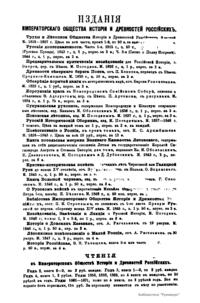 «Чтения в Императорском обществе истории и древностей российских» – периодическое издание трудов Общества. Выпускались отдельными книгами на протяжении 72 лет с десятилетним перерывом. Первая книга вышла в свет в январе 1846 г. Каждая книга состояла из четырех разделов: исторических исследований, отечественных исторических документальных материалов, иностранных материалов и смеси. Публиковались также исследования и материалы по археологии, этнографии, нумизматике, палеографии и другим дисциплинам. До июня 1848 г. было выпущено 23 книги «Чтений». В июньской книге за 1848 г. О. М. Бодянский поместил записки Дж. Флетчера о Московском государстве, что вызвало недовольство Николая I. «Чтения» были закрыты, а Бодянский удален из Московского университета. Издание «Чтений» возобновилось только в 1858 г., когда Бодянский снова стал секретарем общества. Издание приняло славянофильское направление, к прежним четырем разделам «Чтений» прибавился раздел славянских материалов. С 1858 г. «Чтения» выходили в свет четыре раза в год.