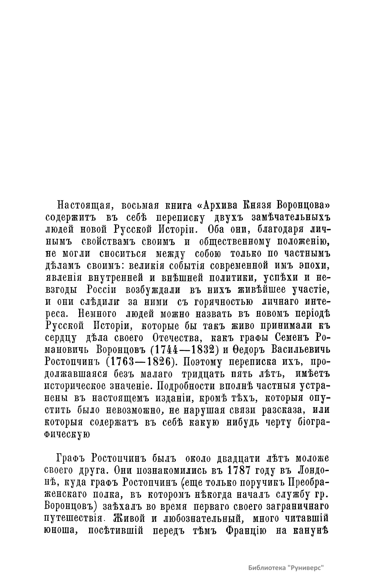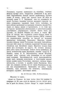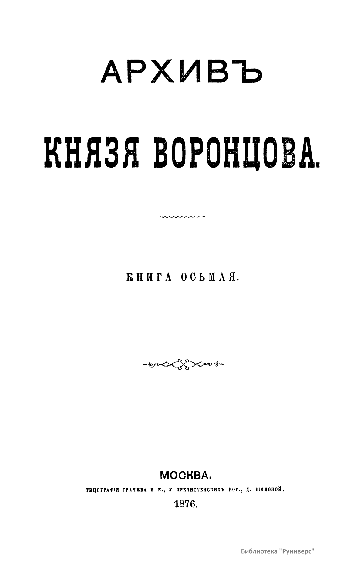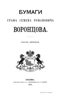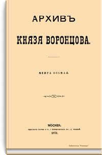 Издание представляет документы из архива графов (с 1845 г. князей) Воронцовых, крупных политических деятелей России XVIII и XIX вв.: Михаила Илларионовича (1714 – 1767) – канцлера при Елизавете Петровне; Романа Илларионовича (1707 – 1783); Александра Романовича (1741 – 1805) – канцлера в 1802 – 1804 гг.; Семена Романовича (1744 – 1832) – посла в Англии в 1785 – 1806 гг.; Михаила Семеновича (1782 – 1856) – фельдмаршала, наместника Кавказа в 1845 – 1853 гг. Архив издан в 40 тт. (1870 – 1895) под редакцией П. И. Бартенева. Содержит огромный материал по внешней политике, по управлению хозяйством Елизаветы Петровны (кн. 1), по делу Миниха и Бирона (кн. 2), о «чумном бунте» 1771 г. в Москве, о движении Е. И. Пугачева (кн. 16), о А. Н. Радищеве (кн. 5, 12, 24). Книга 21-я занята «Записками» Е. Р. Воронцовой (Дашковой). В книге 24-й – свыше 100 писем А. В. Суворова. Среди обширной переписки Воронцовых встречаются письма Вольтера, Д'Аламбера, Жозефа де Местра, Костюшки, Талейрана, Питта и др.