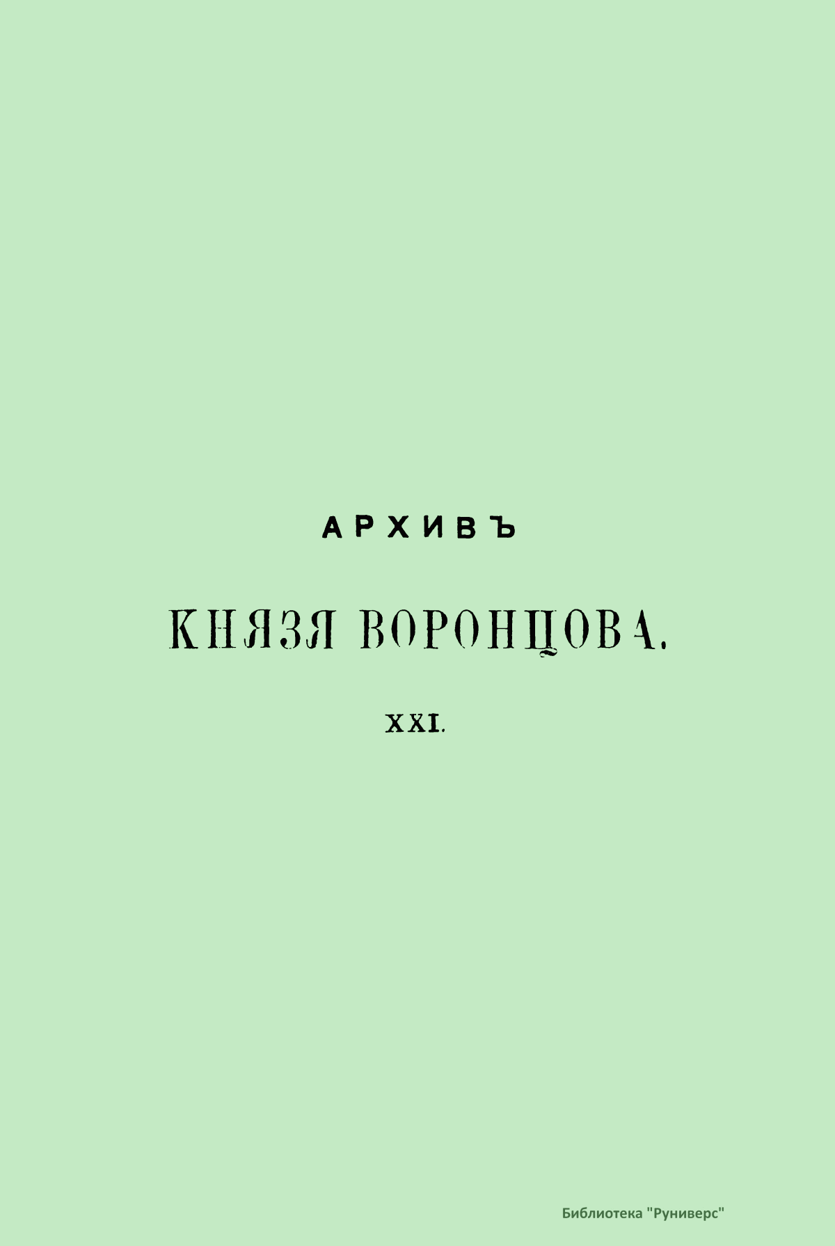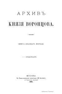 Издание представляет документы из архива графов (с 1845 г. князей) Воронцовых, крупных политических деятелей России XVIII и XIX вв.: Михаила Илларионовича (1714 – 1767) – канцлера при Елизавете Петровне; Романа Илларионовича (1707 – 1783); Александра Романовича (1741 – 1805) – канцлера в 1802 – 1804 гг.; Семена Романовича (1744 – 1832) – посла в Англии в 1785 – 1806 гг.; Михаила Семеновича (1782 – 1856) – фельдмаршала, наместника Кавказа в 1845 – 1853 гг. Архив издан в 40 тт. (1870 – 1895) под редакцией П. И. Бартенева. Содержит огромный материал по внешней политике, по управлению хозяйством Елизаветы Петровны (кн. 1), по делу Миниха и Бирона (кн. 2), о «чумном бунте» 1771 г. в Москве, о движении Е. И. Пугачева (кн. 16), о А. Н. Радищеве (кн. 5, 12, 24). Книга 21-я занята «Записками» Е. Р. Воронцовой (Дашковой). В книге 24-й – свыше 100 писем А. В. Суворова. Среди обширной переписки Воронцовых встречаются письма Вольтера, Д'Аламбера, Жозефа де Местра, Костюшки, Талейрана, Питта и др.