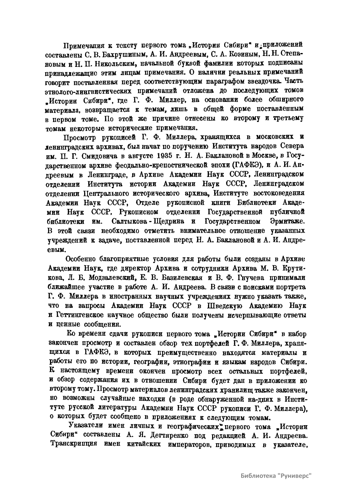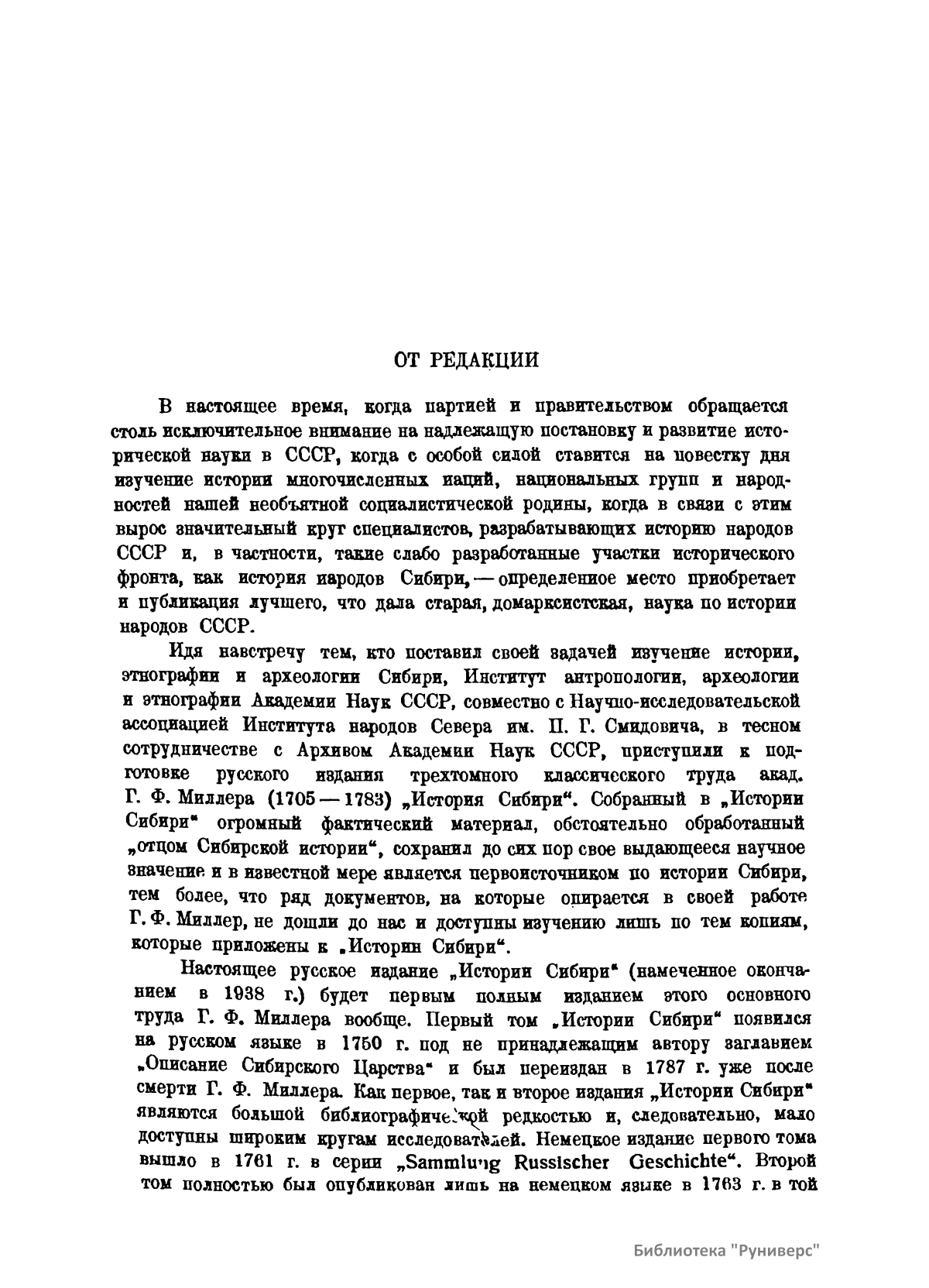 Настоящее издание – первый в истории научный труд по истории Сибири. Составлен в XVIII веке историографом академиком Г. Ф. Миллером (1705 – 1783), который был участником Великой северной экспедиции 1733 – 1743 гг. и написал пятитомную «Историю Сибири», состоящую из 23 глав. Этот труд до сих пор полностью не опубликован. Том I включает автобиографию Миллера, предисловие и текст глав 1 – 5. В «Приложении» публикуются: 1. Исторические акты, относящиеся к главам 1 – 5. 2. Статьи о сибирских древностях: а) о памятниках древности татарской, найденных в могильных холмах близ Абаканского и Саянского острогов; б) о древних памятниках в уездах Селенгинском и Нерчинском; в) изъяснение о некоторых древностях, в могилах найденных; г) о сибирских писаных камнях. Том II включает текст глав 6 – 9. В «Приложении» публикуются: а) исторические акты, относящиеся к главам 6 – 9.
