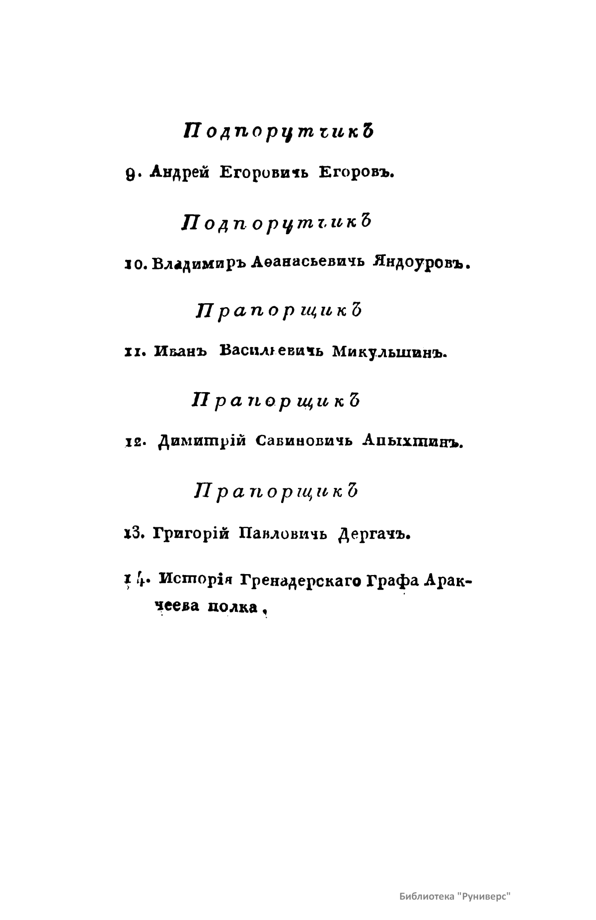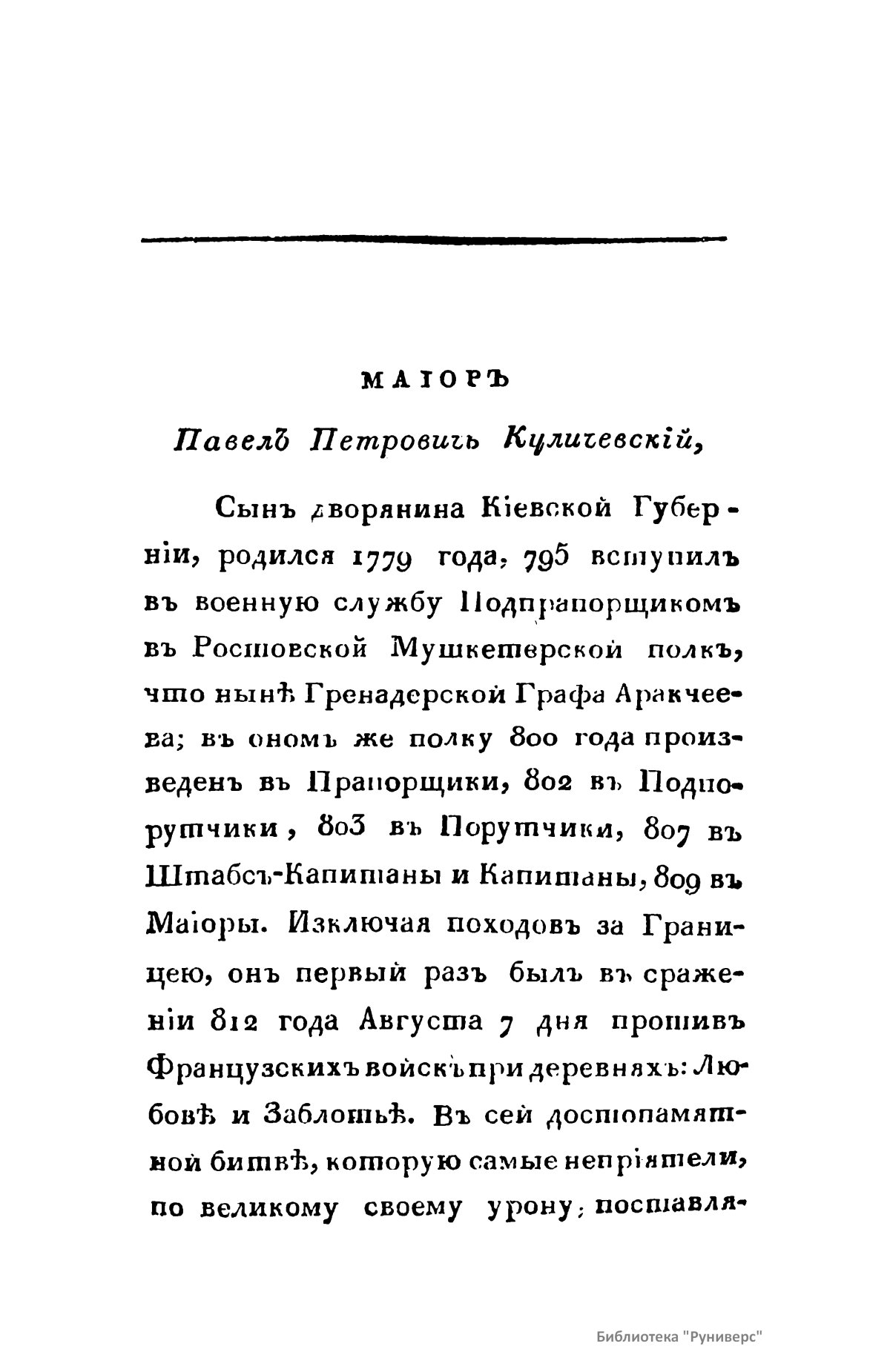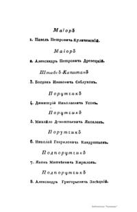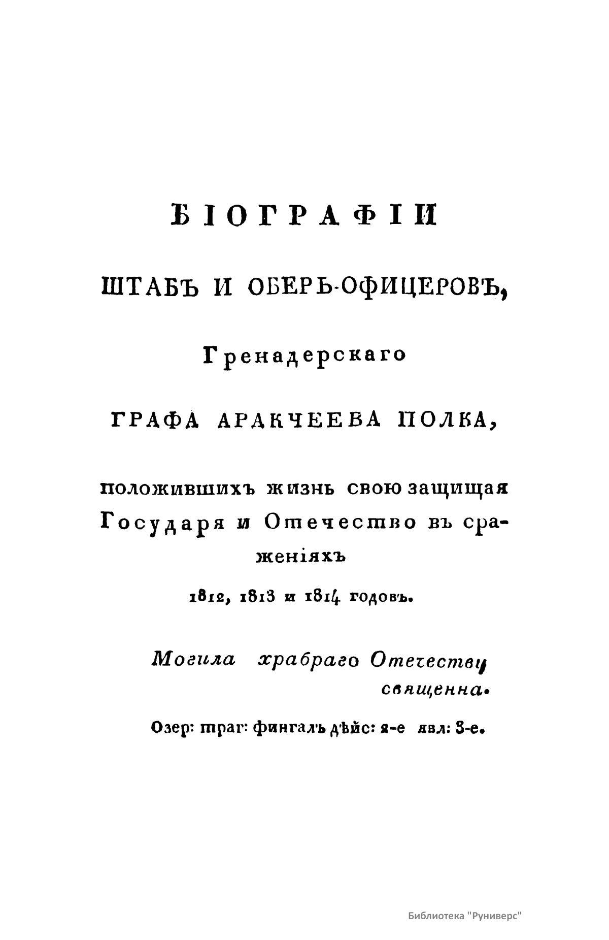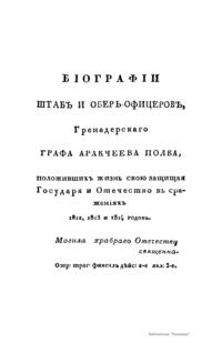 Бiографiи штабъ и оберъ-офицеровъ Гренадерскаго Графа Аракчеева полка, положившихъ жизнь свою защищая Государя и Отечество въ сраженiяхъ 1812, 1813 и 1814 годовъ