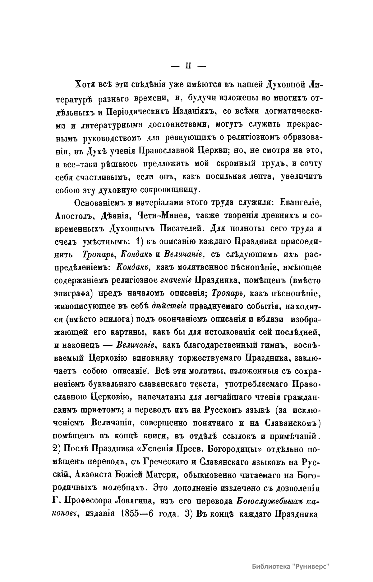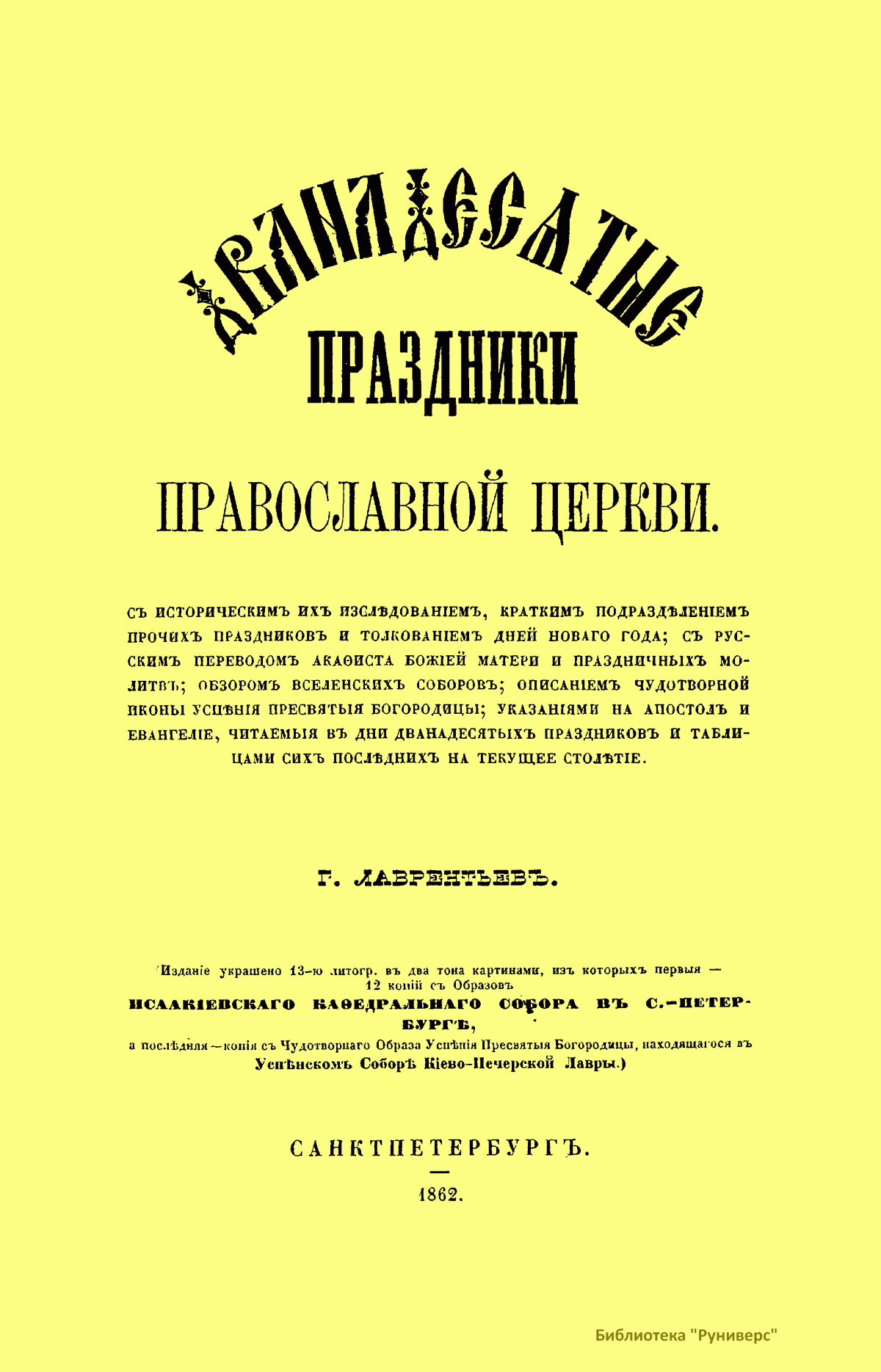Книга посвящена двенадцати праздникам православной церкви: Рождество Пресвятой Богородицы (8 сентября ст. ст.); Воздвижение (14 сентября ст. ст.); Введение во храм Пресвятой Богородицы (21 ноября ст. ст.); Рождество Христово (25 декабря ст. ст.); Богоявление Господне (Крещение) (6 января ст. ст.); Сретение Господне (2 февраля ст. ст.); Благовещение Пресвятой Богородицы (25 марта ст. ст.); Вход господень в Иерусалим (Вербное воскресенье) (подвижный праздник); Вознесение Господне (подвижный праздник); Сошествие Святого Духа (Троицын день) (подвижный праздник); Преображение Господне (6 августа ст. ст.); Успение Пресвятой Богородицы (15 августа ст. ст.). Автор дает полные сведения о содержании каждого праздника, его историческом происхождении и религиозном достоинстве. К описанию каждого праздника присоединены песнопения: тропарь, кондак и величание. После праздника «Успение Пресвятой Богородицы» помещен перевод на русский язык акафиста Божией Матери, который обычно читается на Богородичных молебнах. В отделе ссылок и примечаний находится краткий исторический обзор Вселенских соборов. Издание украшено 13 литографиями.