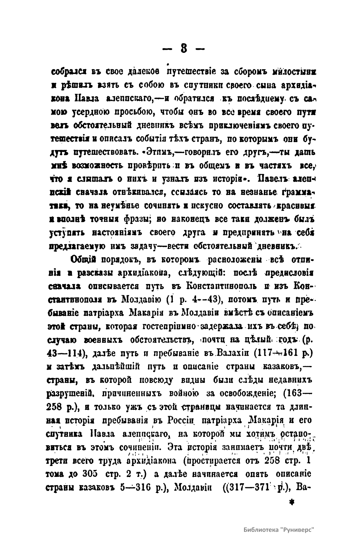 Настоящее издание – часть дневника архидьякона Павла Алеппского (Халеб, Алеппо – город в Сирии), посвященная России. Этот дневник он вел во время путешествия за сбором милостыни со своим отцом Антиохийским патриархом Макарием по Турции, Молдавии, Валахии, Малороссии и России с 1652-го по 1657 г. Описание путешествия по России (1654 – 1656) занимает две трети труда архидьякона. «Изложение и объяснение всего, что мы видели и освидетельствовали собственными глазами – вот предмет всего этого труда», – говорит сам автор в предисловии к своему сочинению. Подробный анализ публикации находится в конце книги (стр. 189).