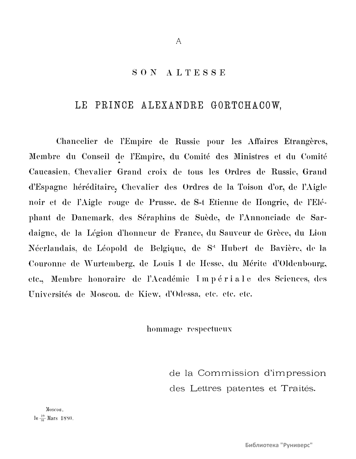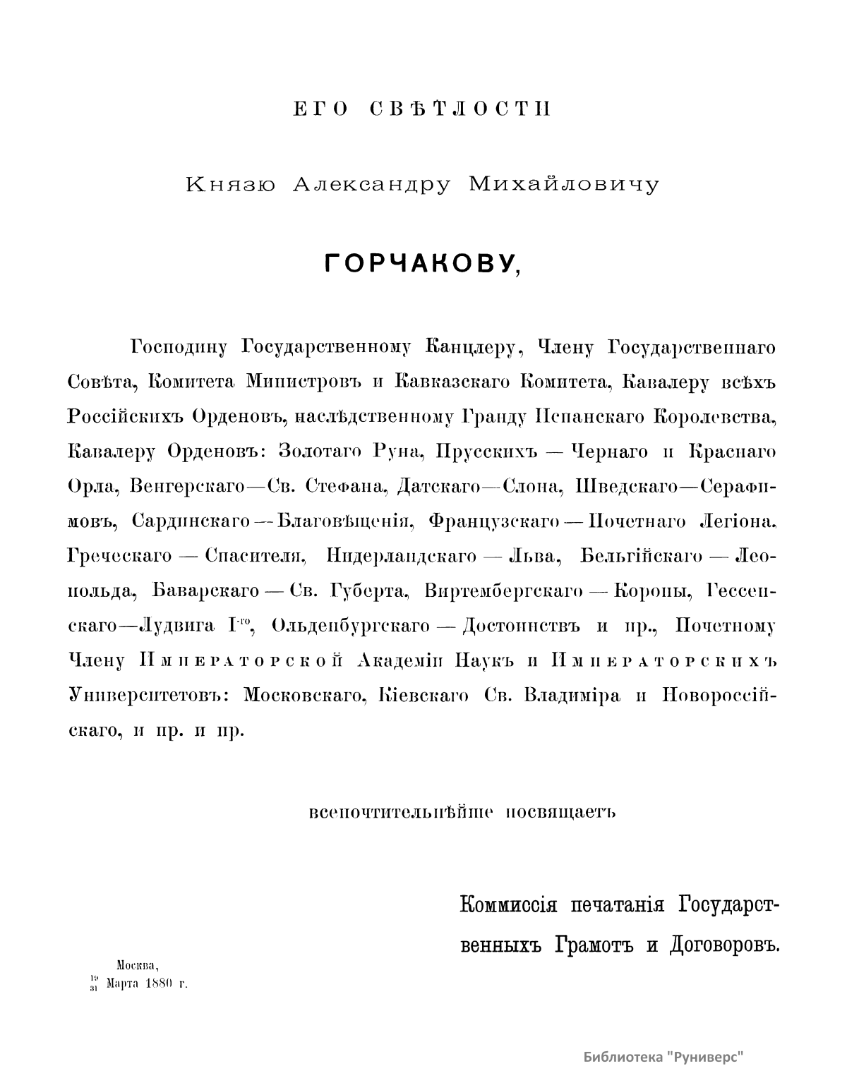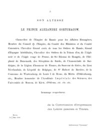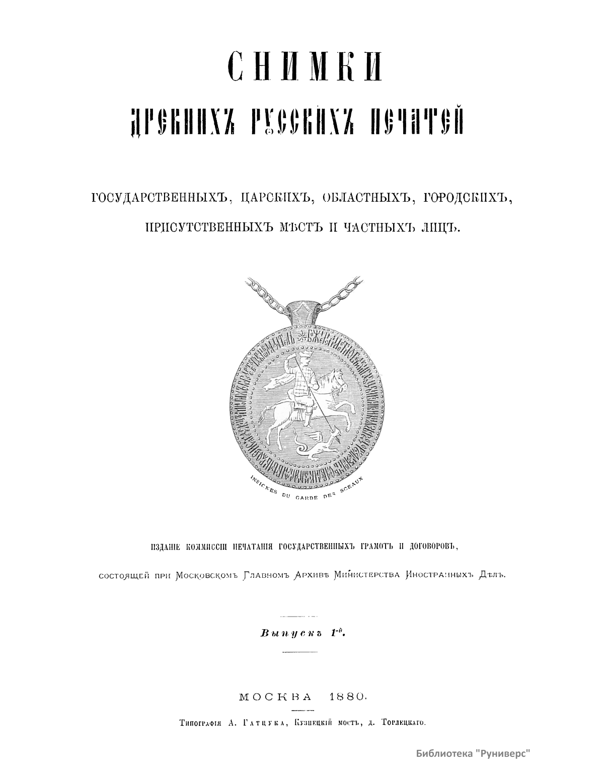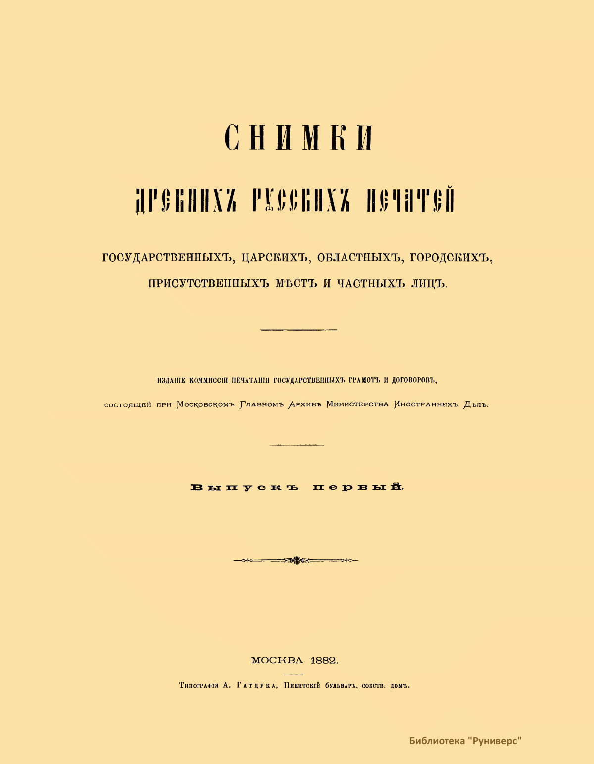В первом выпуске альбома комиссии печатания государственных грамот и договоров, состоявшей при Московском главном архиве Министерства иностранных дел, опубликованы снимки: печатей государственных, царских и патриарших; печатей областных и городских; печатей и перстней удельных князей, архиереев, должностных и частных лиц. Каждое изображение снабжено кратким комментарием. Издание посвящается князю Александру Михайловичу Горчакову – министру иностранных дел Российской империи (1856 – 1882), хранившему государственную печать, которая «была приложена более чем к пятидесяти трактатам и конвенциям, заключенным на пользу нашего дорогого Отечества, при глубоком знании его интересов».