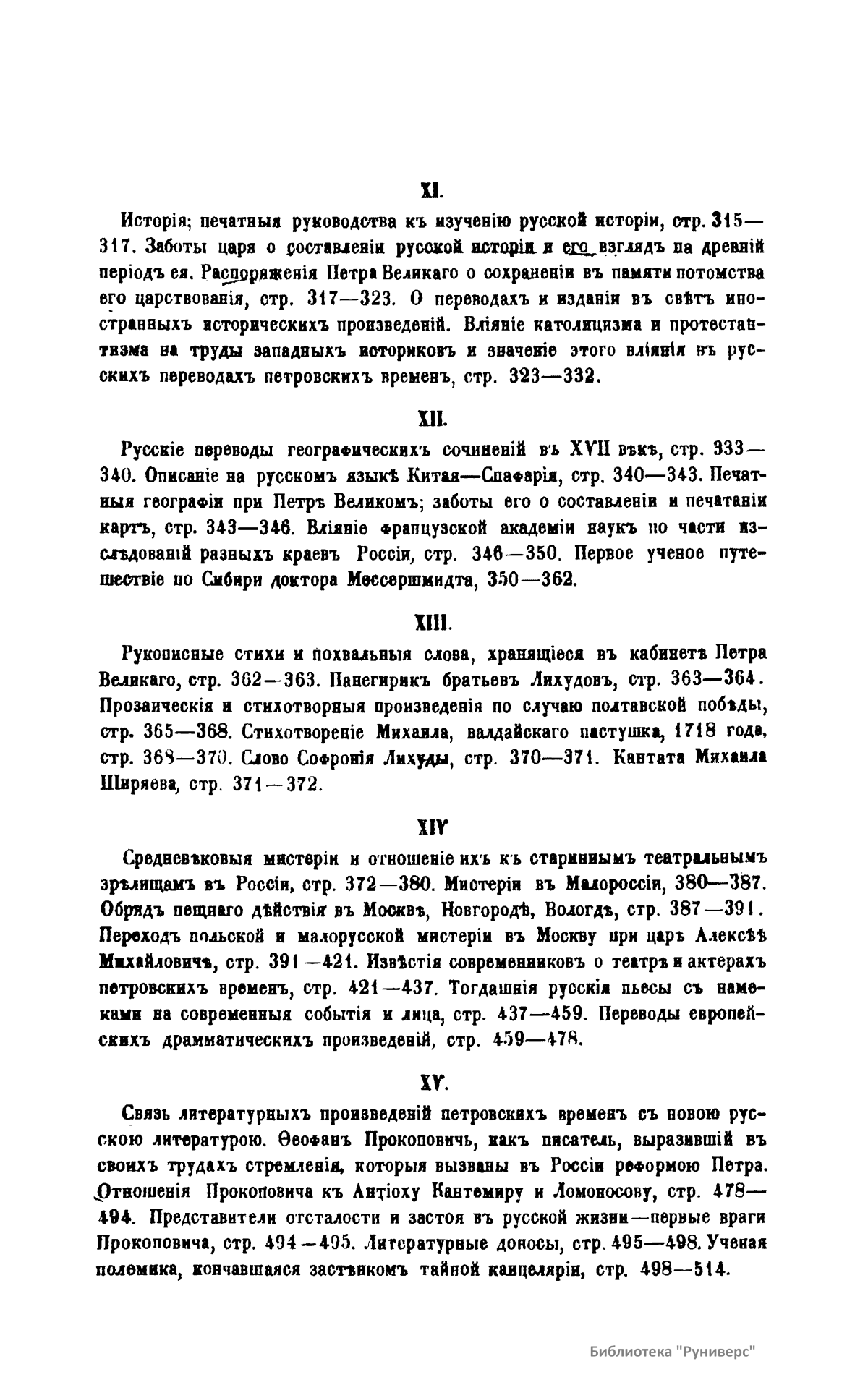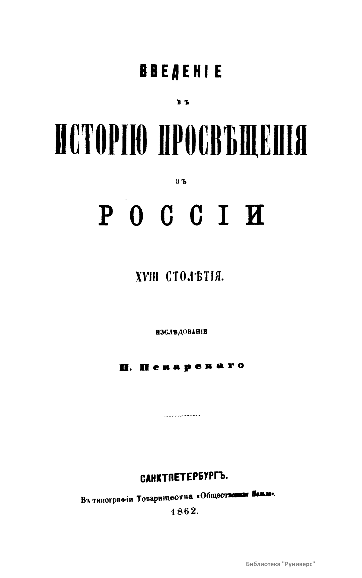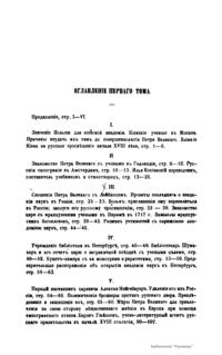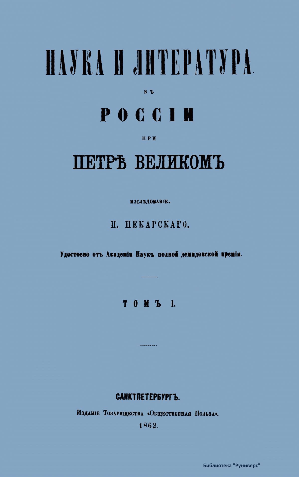 Сочинение, удостоенное от Академии наук полной демидовской премии. Первая часть настоящего исследования заключает в себе введение в историю русского просвещения начала XVIII столетия. Работая над этой частью, автор не ограничился только печатными памятниками эпохи, он собирал все доступные ему сведения о школах, о состоянии наук, о степени влияния европейского образования, противодействии при том старины и т.п. Вторая часть посвящена исследованию о тогдашних русских типографиях и описанию произведений, которые там печатались со времени первого путешествия Петра Великого по Европе до его кончины, то есть с 1698-го по 1725 год.